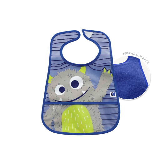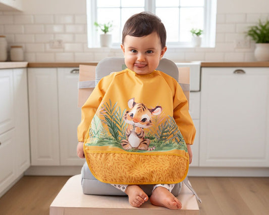 Diseñado específicamente para las comidas, está fabricado con materiales resistentes como plástico, silicona o neopreno. Su característica principal es la bolsa inferior, que recoge restos de alimentos sólidos o líquidos, manteniendo la ropa del bebé limpia y seca.