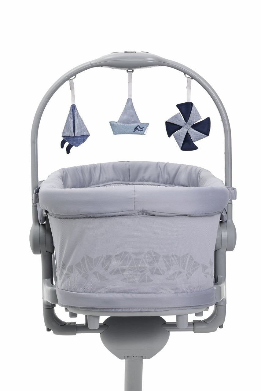 Este sistema evolutivo y práctico cuenta también con barra de juegos electrónica con luces, sonidos y 3 elegantes juguetes colgantes. Se puede extraer de la estructura para la modalidad de trona, o colocar otros juguetes.