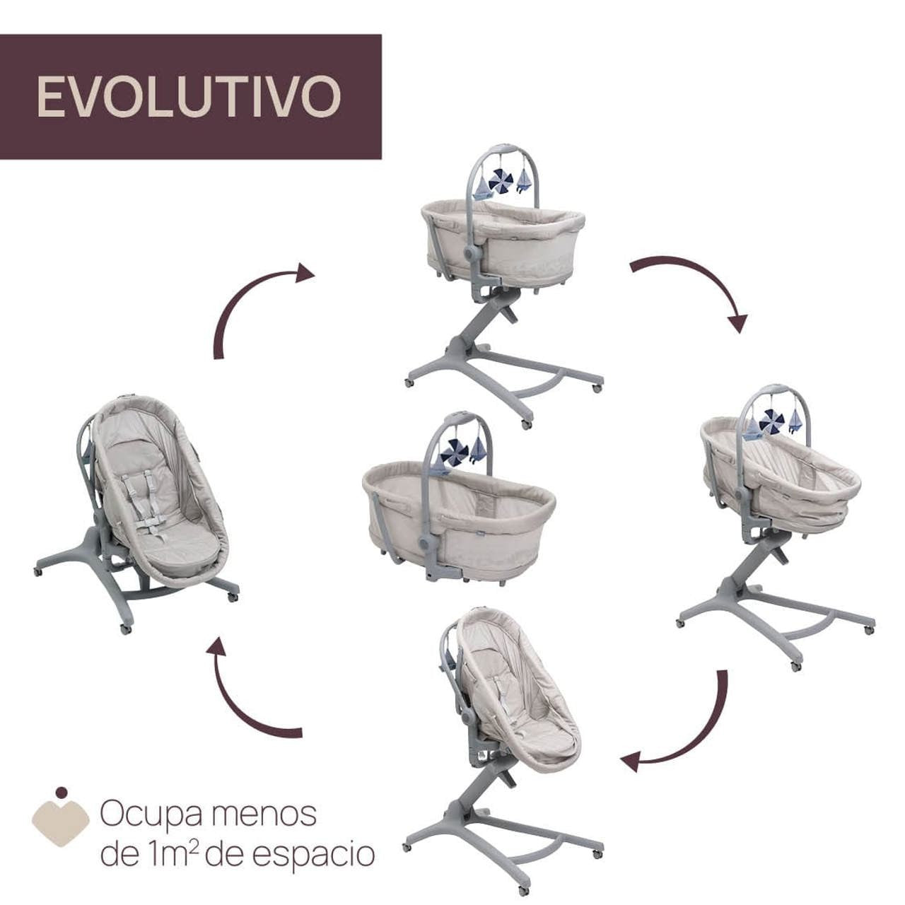 Solución exclusiva 5 en 1 que simplifica la rutina diaria del bebé: moisés extraíble, cuna, hamaca reclinable, trona y primera silla ¡Todo en un único producto hasta los 3 años!