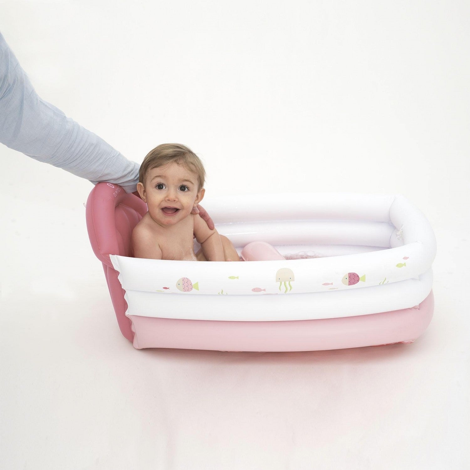 Pensada para llevarla de viaje ocupando muy poco espacio • Separador para evitar que el bebé se deslice, se ajusta fácilmente mediante un velcro • Muy resistente, con 3 válvulas de seguridad • Se puede utilizar dentro de una bañera o plato de ducha.