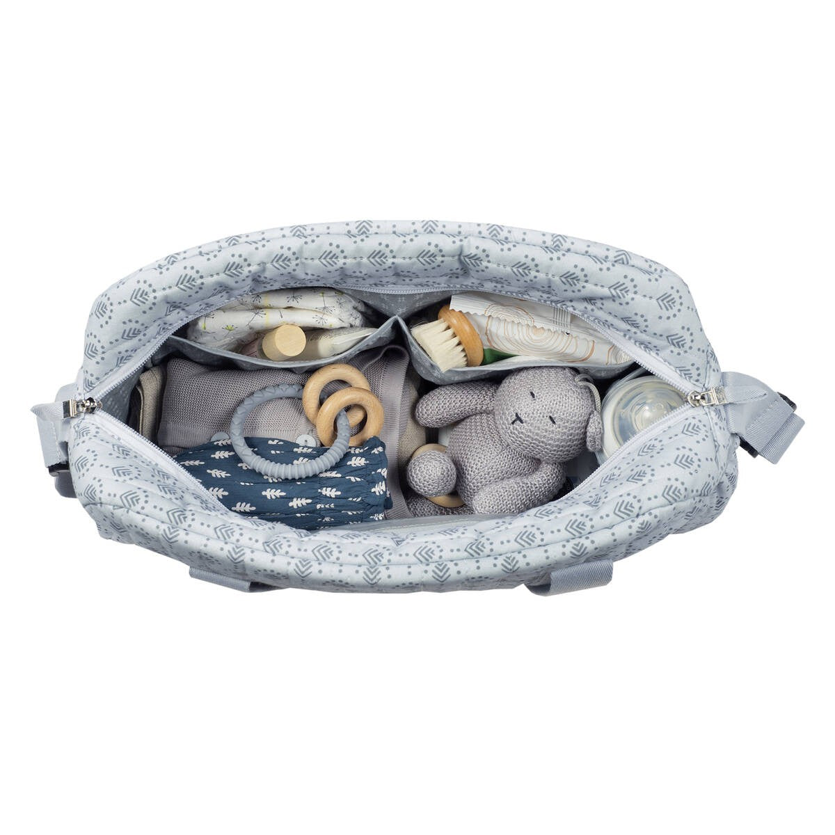 En el exterior, encontrarás dos bolsillos laterales ideales para botellas o biberones, así como un bolsillo frontal con cremallera. En el interior, incorpora un bolsillo plastificado para la ropa húmeda, un bolsillo térmico para los biberones y dos bolsillos adicionales para tener a mano lo que necesites. El bolso cuenta con un sistema universal de fijación que facilita su colocación en cualquier modelo de silla de paseo. Viene con dos asas cortas ajustables para mayor comodidad, una asa larga para colgarlo en el hombro y asas cortas para llevarlo en la mano.