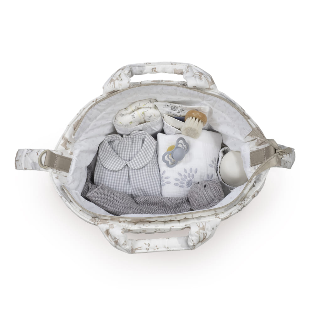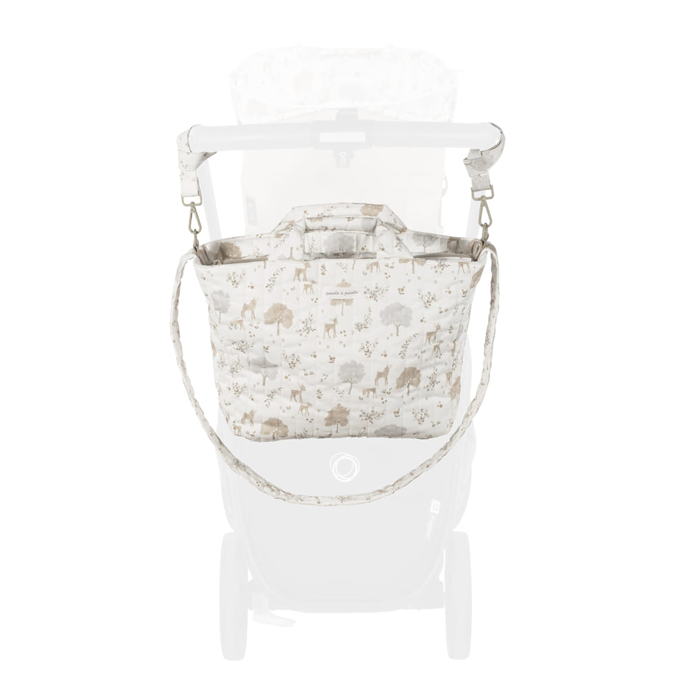 La bolsa para carrito de bebé o el bolso para silla de paseo Nara de Pasito a pasito es un modelo único, elaborado en loneta de algodón 100% con un delicado estampado de ciervos y árboles en tonos neutros. Su tratamiento waterproof la hace resistente al agua, garantizando protección y durabilidad en el día a día. Es un diseño muy elegante y práctico que ofrece gran capacidad para que puedas llevar de todo. Viene acondicionado con doble asa, una larga para colgar en el hombro y unas cortas de mano. Incluye asas adicionales universales para colgarla al cochecito. Además, puedes usarla para guardar tus cosas y así evitas llevar dos bolsas al mismo tiempo. Si estás en la dulce espera puedes tenerla preparada como bolsa del bebé para el hospital. Acabados de calidad. La bolsa canastilla de bebé cuenta con un forro interior y bolsillos para colocar de forma organizada el biberón, cubiertos, toallitas, pañales, cremas y cualquier otra cosa que necesite tu hijo. Entre los bolsillos hay un bolsillo térmico para biberones y un bolsillo plastificado para la ropa mojada. Incluye cambiador. Está fabricado con materiales de gran calidad, libres de colorantes azoicos, ftalatos y sustancias nocivas para la salud. Además, se puede lavar a mano o a máquina a temperaturas de hasta 30º. Los productos para bebé de Pasito a Pasito cuentan con un diseño muy diferente a todas las demás. Sus colecciones se caracterizan por el trabajo al detallada, pensadas siempre desde un punto de vista práctico. Utilizan materiales de primera calidad para remarcar la elegancia y la armonía en cada una de sus piezas. Nuestros modelos son exclusivos y de estilo inconfundible, pensados para madres actuales que gozan de buen gusto y que aprecian los detalles tanto como nosotros. Especificaciones: Materiales: 100% algodón. Medidas: 37X30X12 cm.
