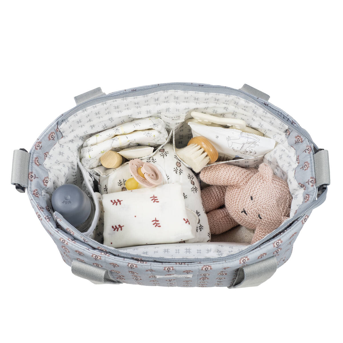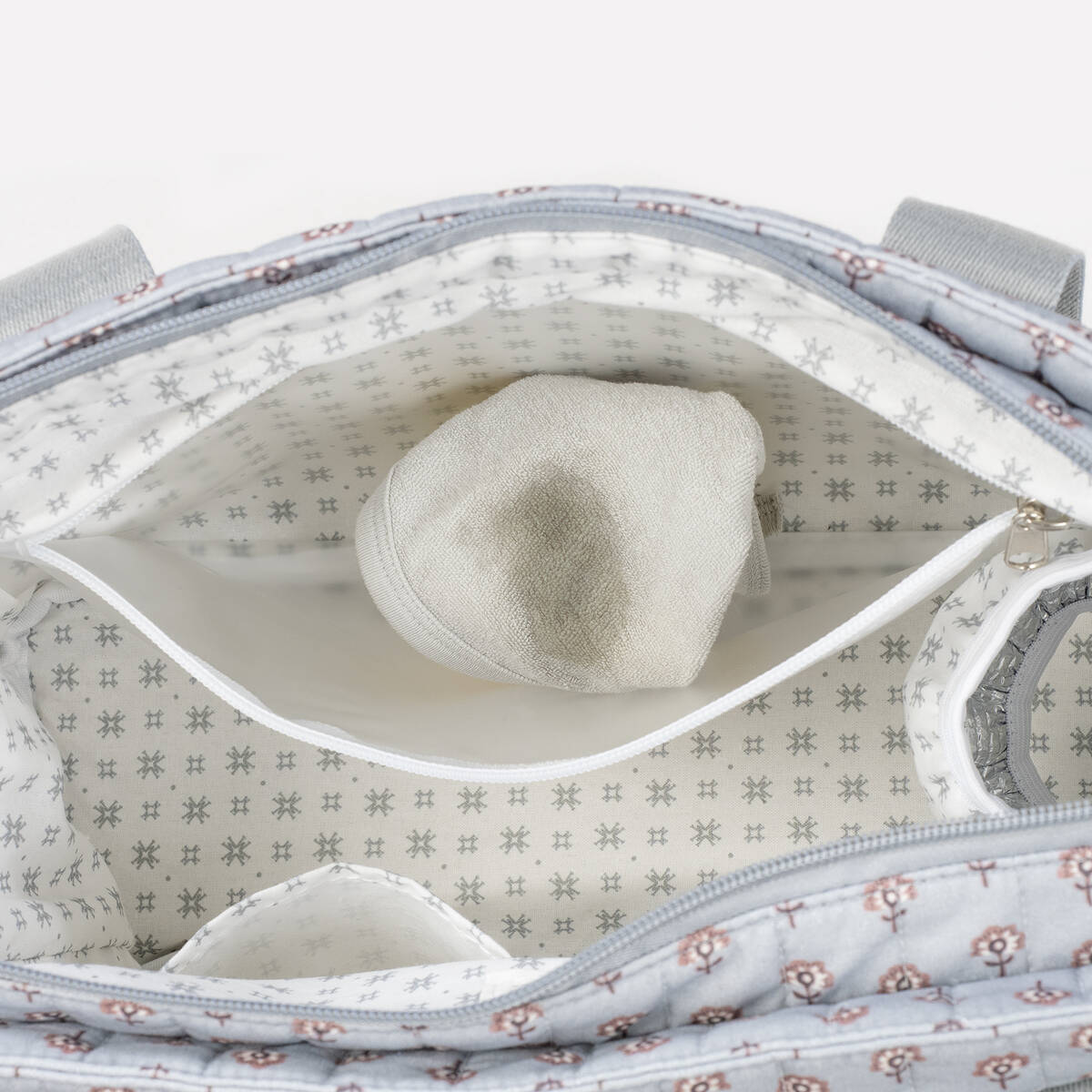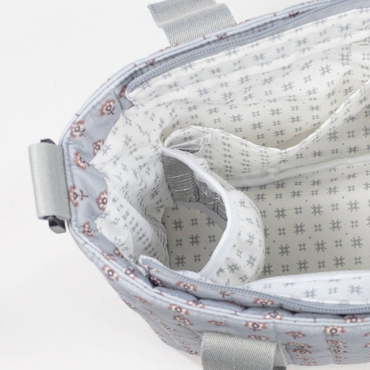 El bolso crossbody Indian Lotus con estampado de flores en tono gris para silla de paseo es un modelo muy ligero además de ser resistente y espacioso para que puedas llevar todo lo que podrías necesitar durante el paseo de tu bebé. Aparte de la gran capacidad que tiene, está distribuido para facilitarte la organización, con varios bolsillos interiores que te ayudarán a colocar todos tus complementos ordenados y así puedes ubicarlos más fácil cuando vayas a usarlos. Dispone de un bolsillo plastificado interior para la ropa húmeda, un bolsillo térmico interior y dos bolsillos laterales. Incluye cambiador. Su diseño moderno y casual lo hacen perfecto para usar a diario y combinar con tus looks casuales o deportivos. Incorpora asas cortas con las que puedes fijarla a cualquier modelo de silla de paseo y asa larga para que te la puedas colgar en el hombro. Gran calidad y mucho estilo. Fabricado en un material resistente y de fácil limpieza a mano o a máquina a 30 °C. Walking Mum protege a tu bebé utilizando los mejores tejidos, libres de colorantes azoicos y sustancias nocivas para la salud. Nuestra colección Walking Mum está diseñada con un particular sello de estilo urbano y moderno que no pasa desapercibido, para vestir diferente los paseos con tu bebé. Las bolsas de maternidad de esta línea son más sport y prácticas, especialmente pensadas en mamás y papás modernos que aprecian los diseños más actuales y en tendencia sin dejar de lado la calidad y la funcionalidad de los accesorios que complementan y hacen más cómodos todos los paseos con sus bebés. Especificaciones: Materiales: 100 % algodón con tratamiento waterproof. Medidas: 33X25X12 cm.
