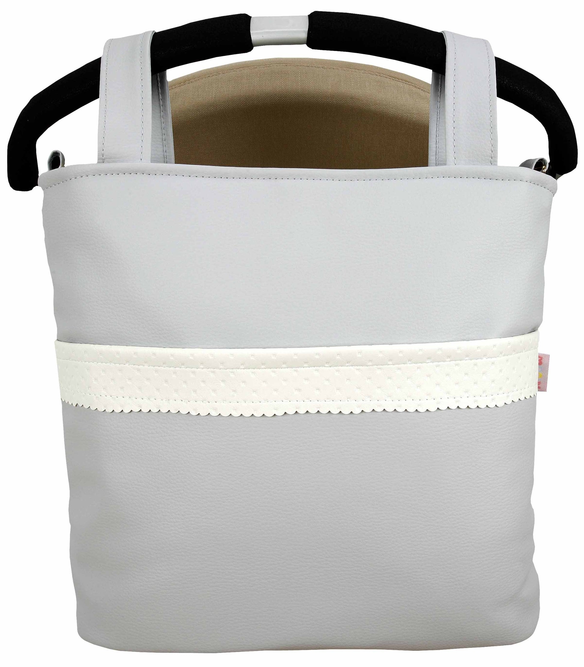 Polipiel rugosa combinada con polipiel perforada. Bolsillo Exterior, bolsillo interior. Asa para colgar en el carro.