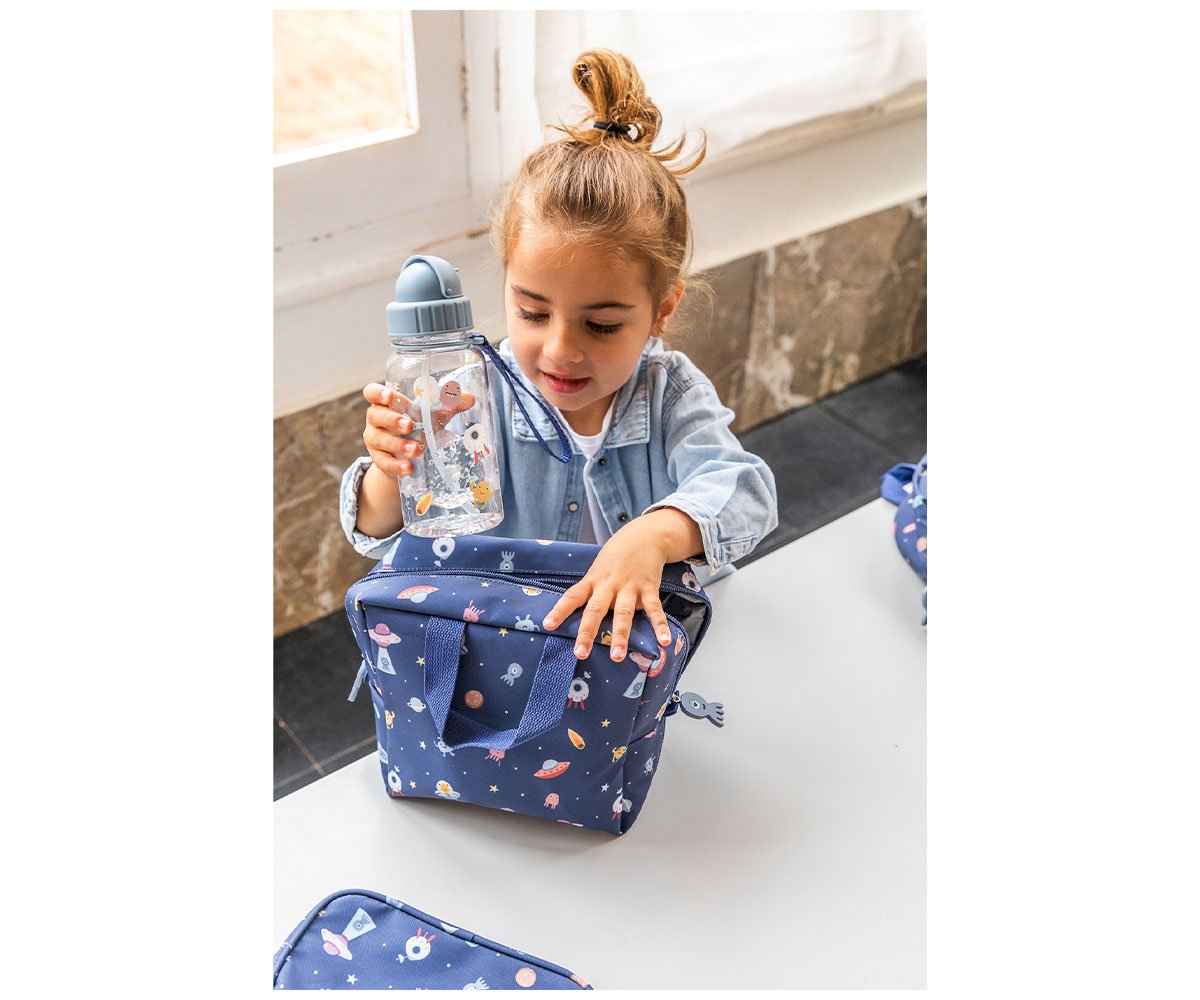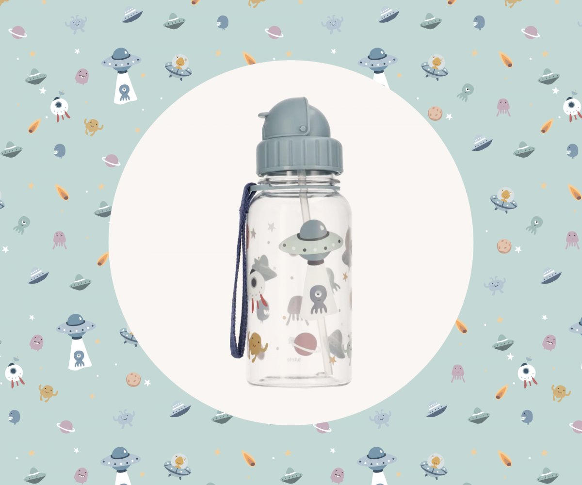 La botella tiene una pajita de silicona abatible que sale automáticamente cuando se abre la tapa y es ideal para llevar al cole.