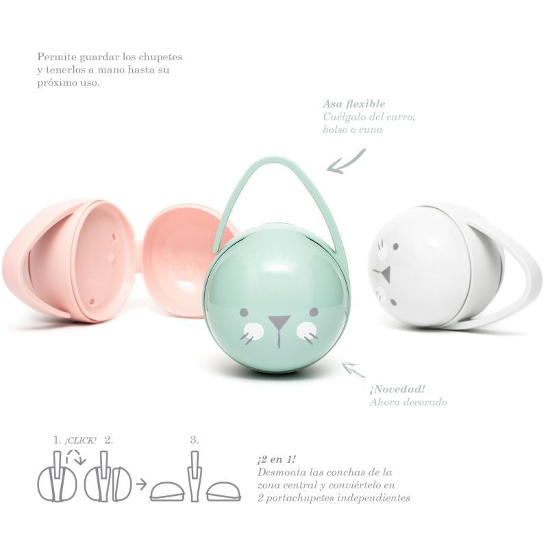 El portachupetes duo permite guardar los chupetes y tenerlos a mano hasta su próximo uso.