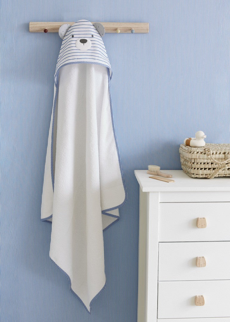 Toalla tipo capa de diseño envolvente con la que podrás secar y abrigar a tu bebé después del baño. Elementos de adorno: aplique de orejitas. Diseño con delicados motivos infantiles. Este artículo se presenta en una caja de la línea Newborn ideal para regalar en ocasiones especiales.