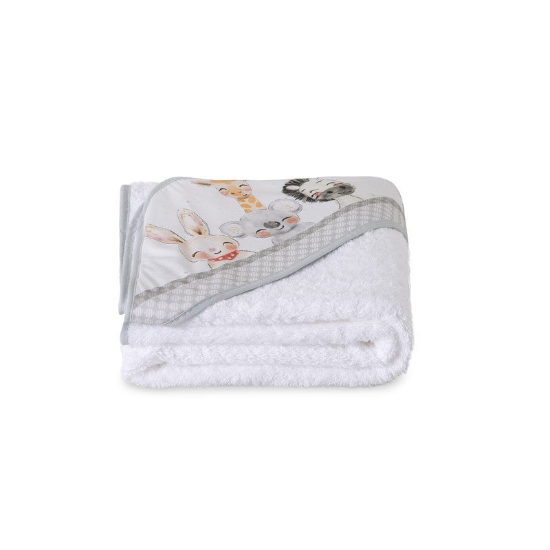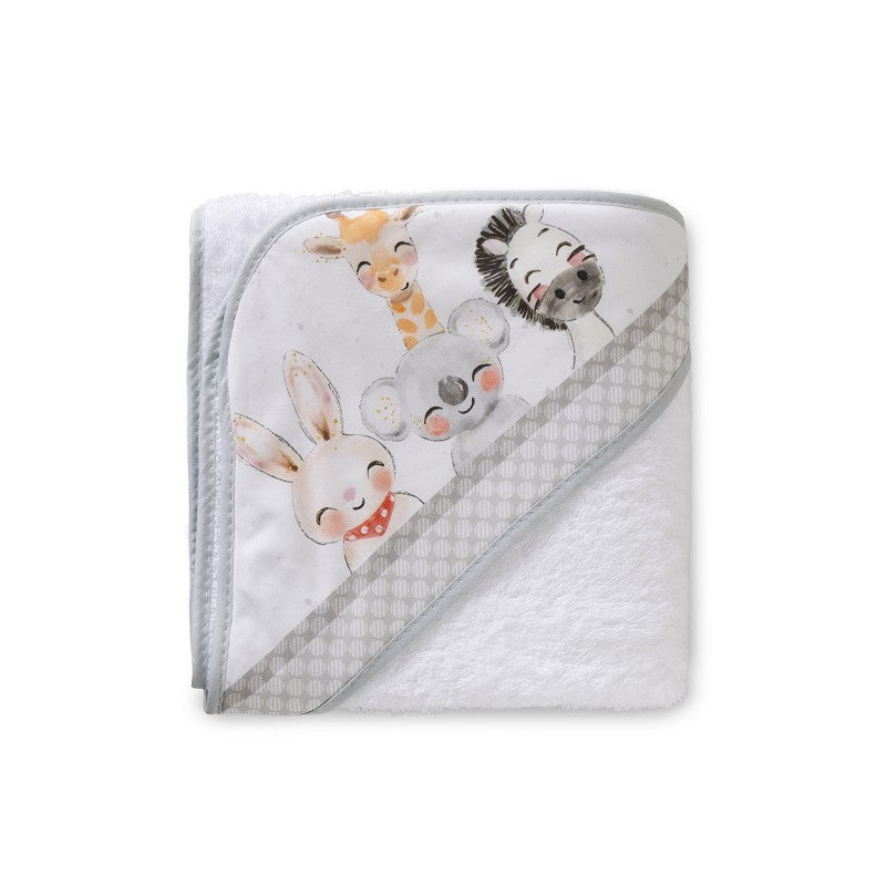 Capa de baño para bebés de la firma Interbaby Animales Acuarela. Fabricadas 100 % algodón de 400 gr/m2. Esto garantiza la suavidad necesaria para el secado de la piel del bebé tan delicada. Gracias a su medida extra grande, 1 metro x 1 metro. permite arropar al bebé fácilmente a la salida del baño.