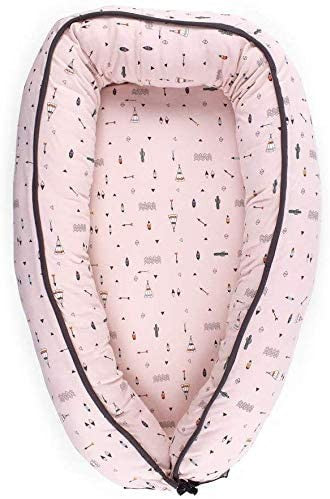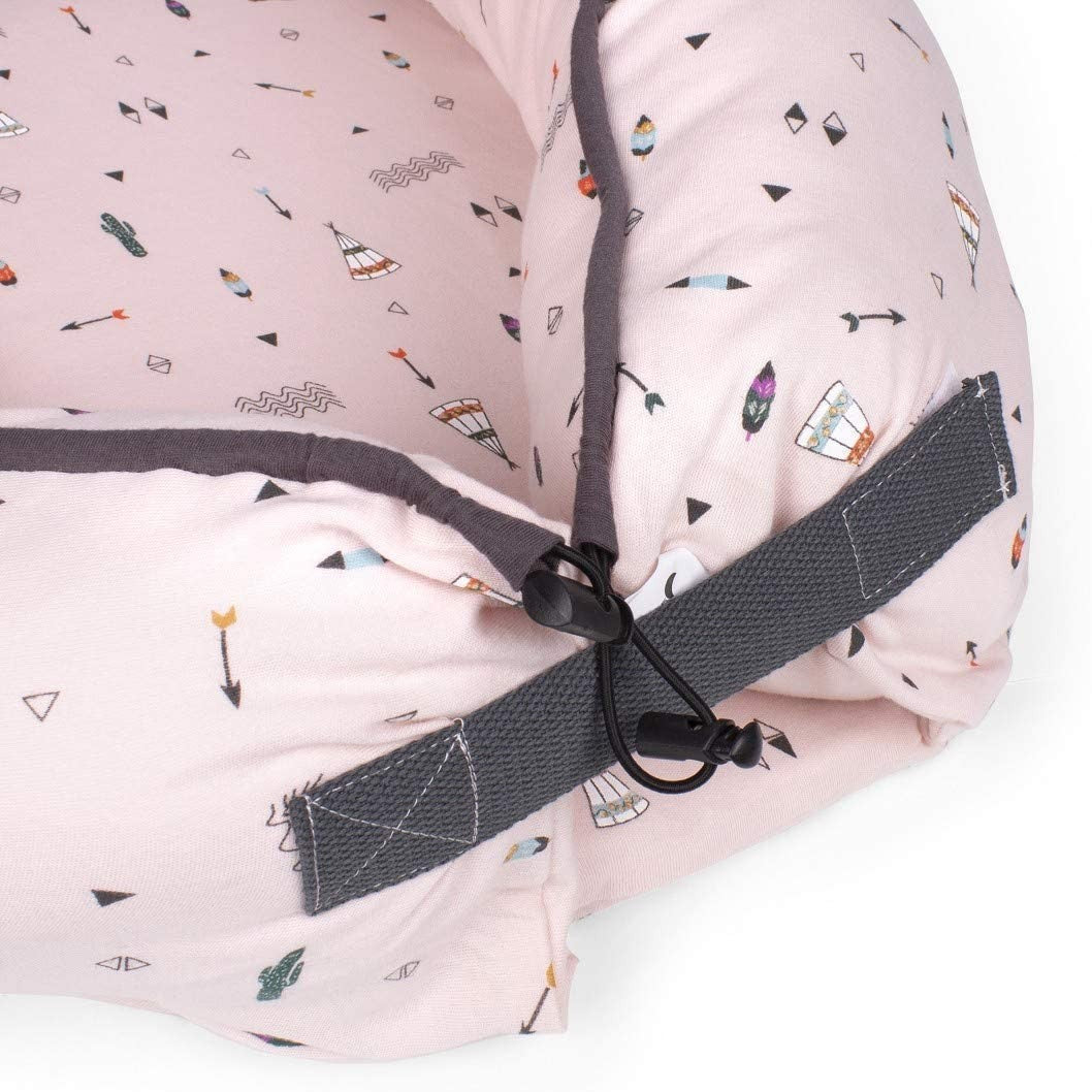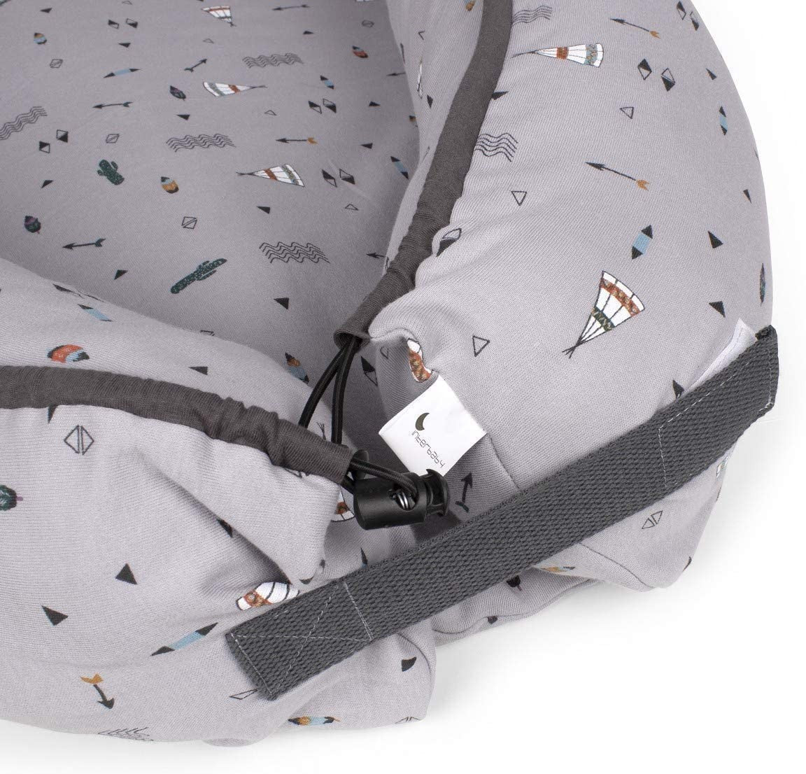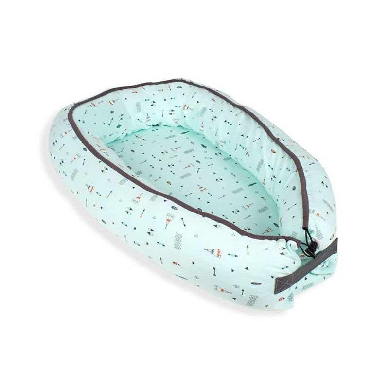 Almohada nido para bebés con estampado indio de la marca Interbaby, modelo Cabañas verde 961. Almohada nido confortable y ajustable indicada para recién nacidos a 6 meses para mantenerlos cómodos y seguros en cualquier lugar: cama, sofá, suelo, etc. La almohada es desenfundable para poder lavarla.