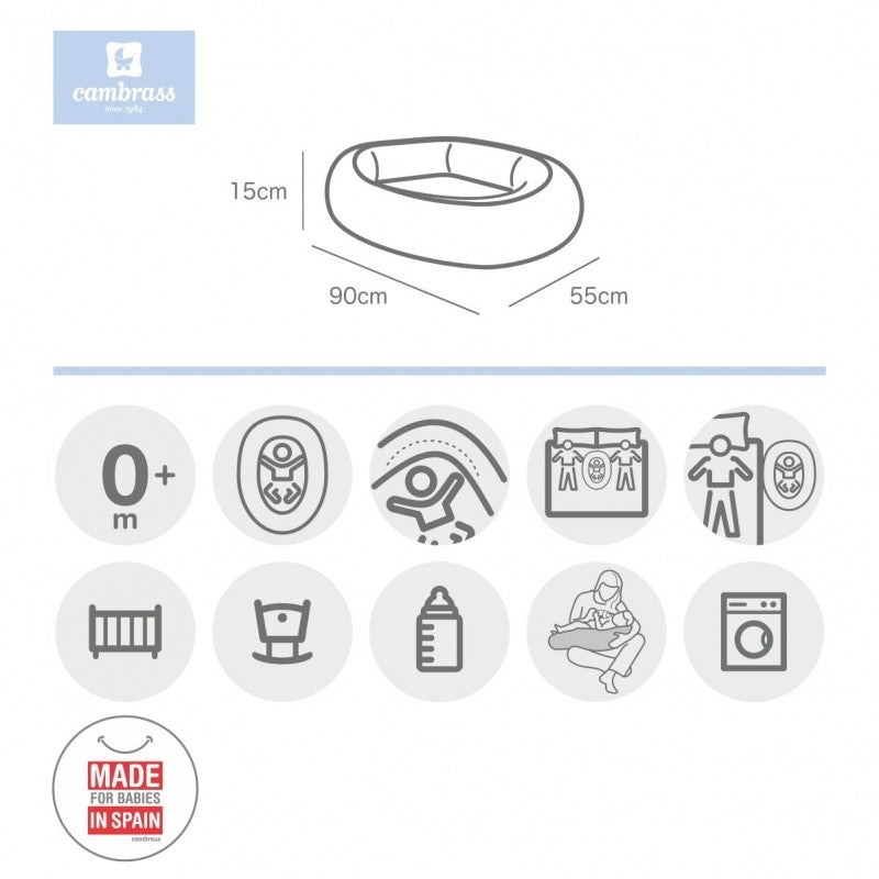 La cuna nido de Cambrass, es un artículo multiuso, para poder poner el bebé dentro en los primeros meses de vida, su función principal es proteger al bebé y mantenerlo seguro, se puede utilizar en la cama de los papás, en la cuna, en la minicuna y su cojín exterior se puede utilizar como cojín de lactancia. Made in Spain.- Subfamilia: 1615