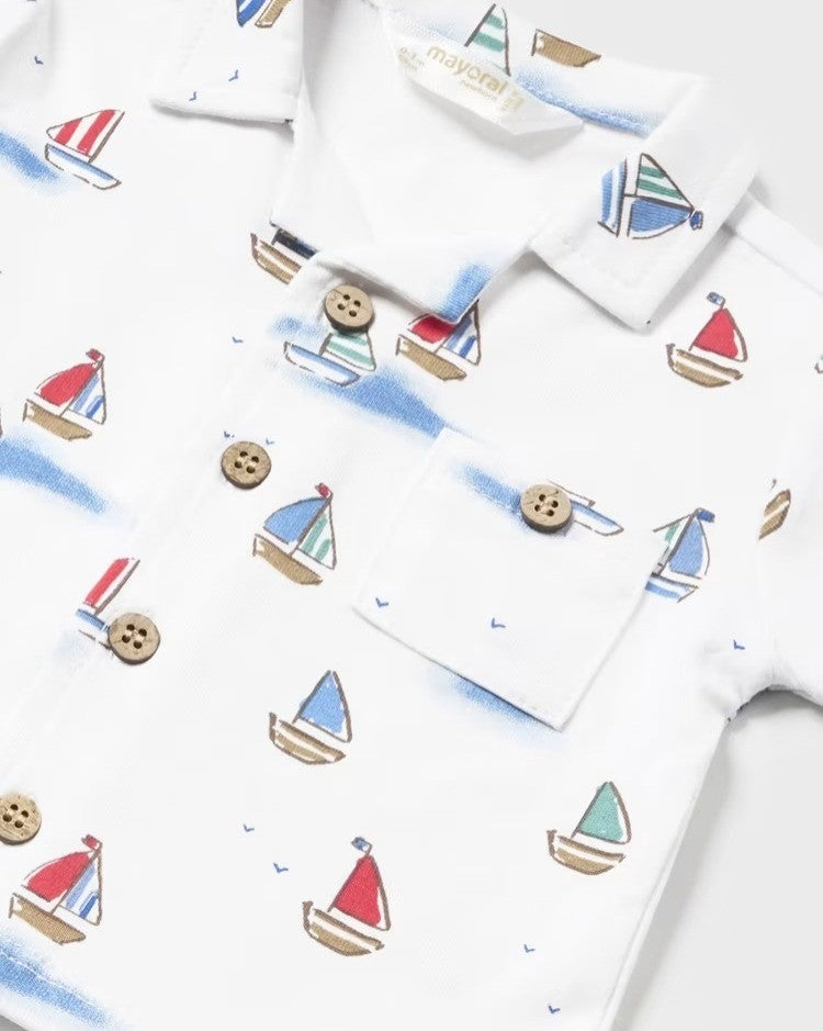 Camisa de manga corta para recién nacido. Cierre con botones en la parte delantera. Bolsillo funcional en la parte delantera. Diseño estampado.