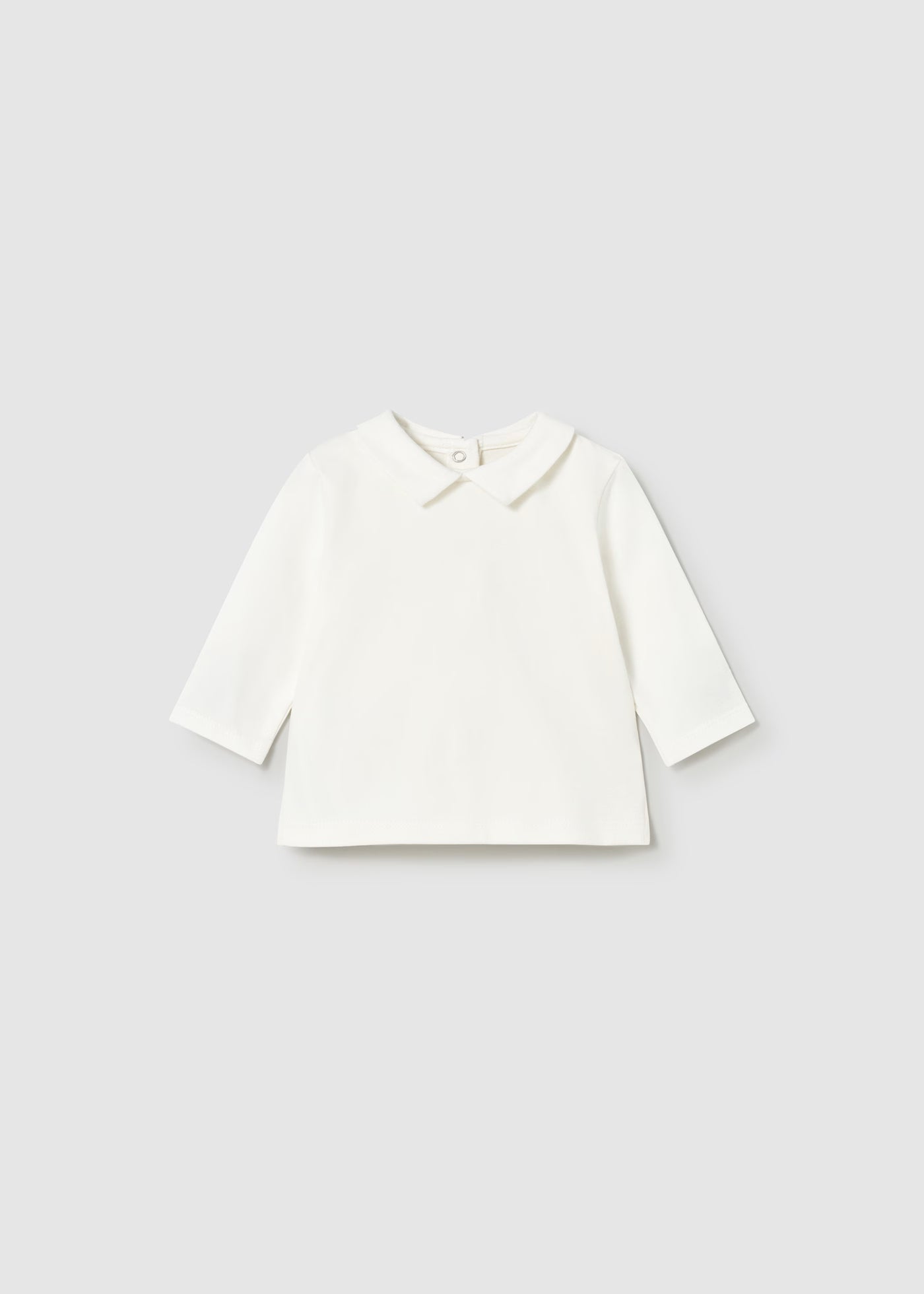 Camiseta de manga larga para recién nacido. Cierre con botones a presión en la parte posterior. Modelo con aberturas laterales en el bajo que dan mayor holgura.