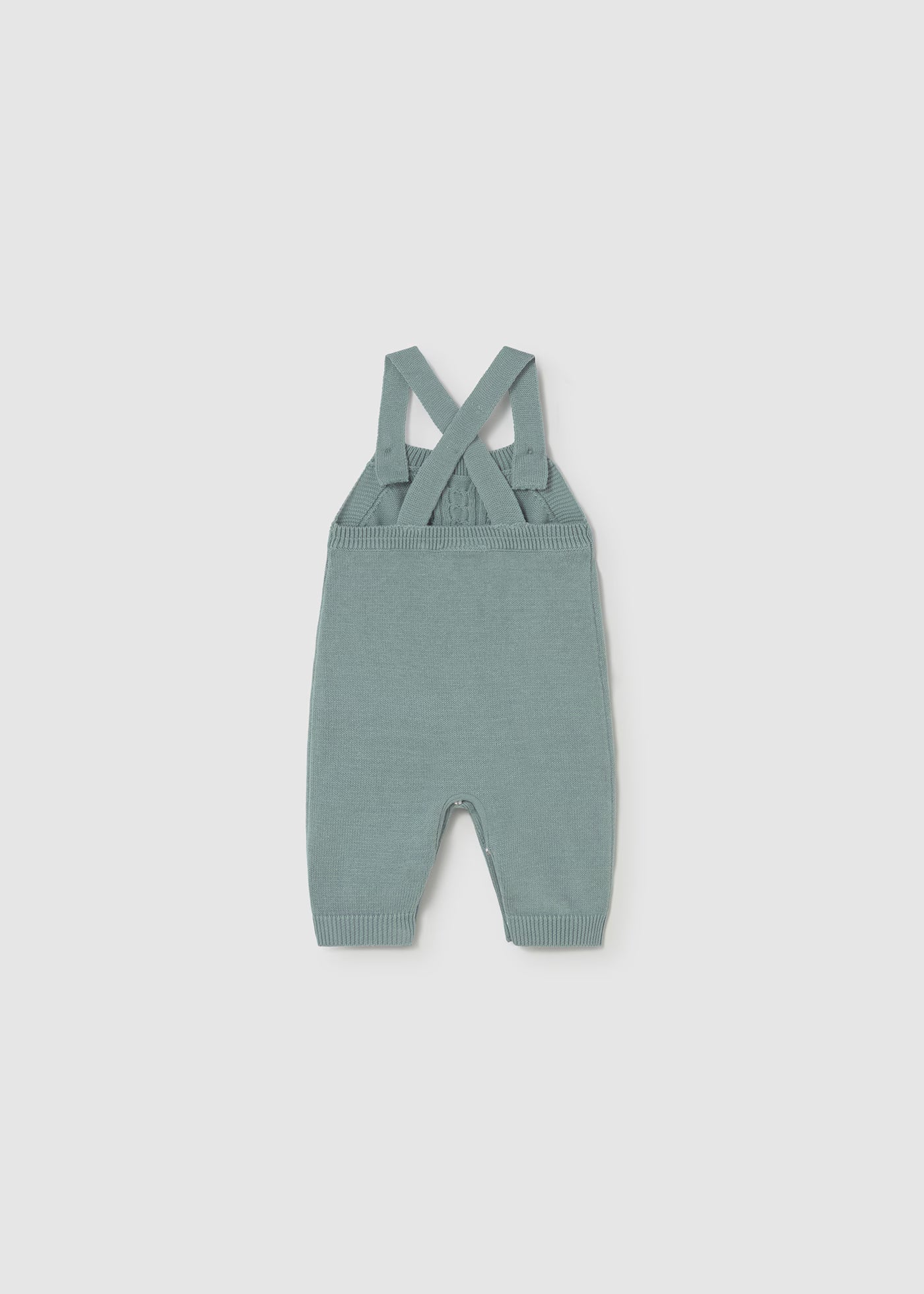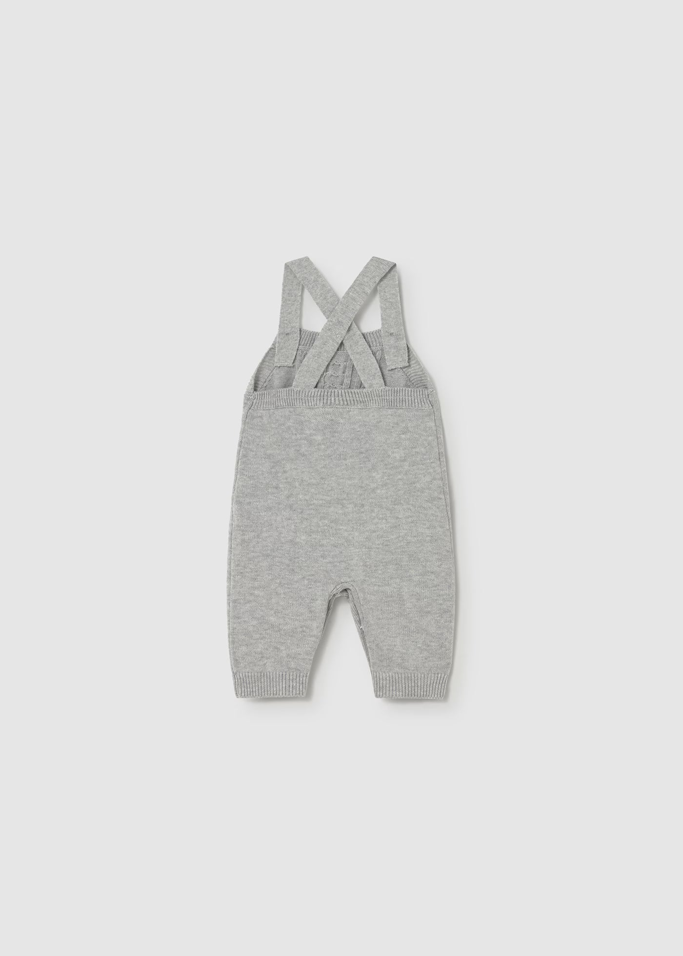 Original pantalón peto para recién nacido. Botones a presión en la entrepierna para facilitar la puesta de la prenda. Cierre con botones. Diseño exterior con efecto trenzado.