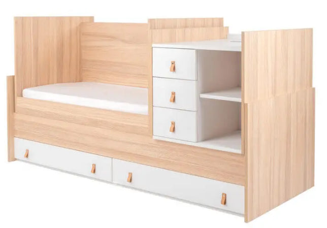 Una vez queremos hacer la transformación de la habitación, el mismo módulo se transforma en una cama de tamaño adulto, con el módulo de mesita, los cajones inferiores y un escritorio. ¡Todo en uno!