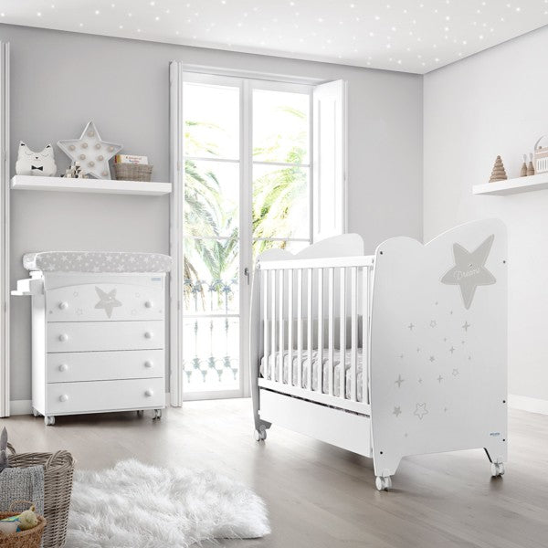 La cuna Estela de 120 x 60 cm puedes acompañarla con su bañera Estela, convertible en cómoda y también con cualquiera de los textiles de micuna, 100% algodón, perfectos para arropar a tu bebe mientras descansa en su cunita.