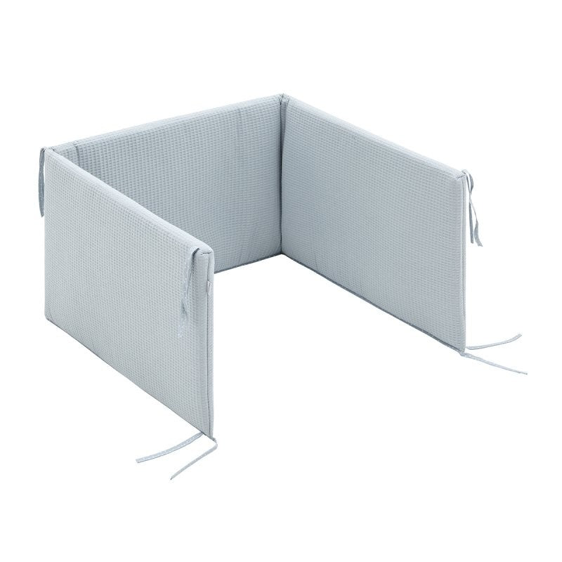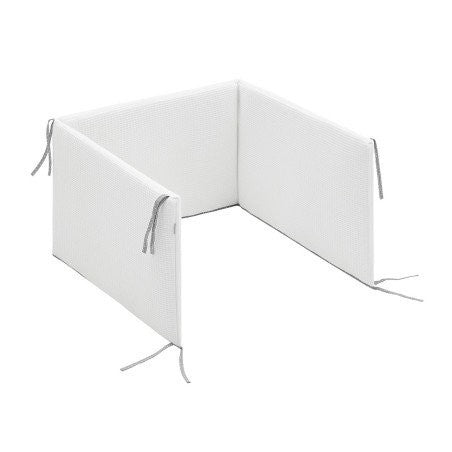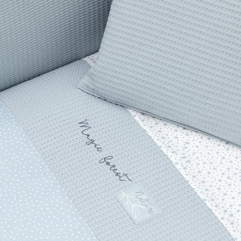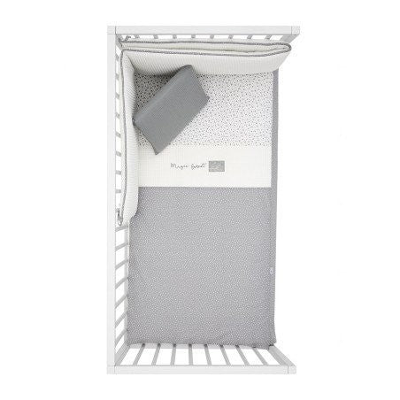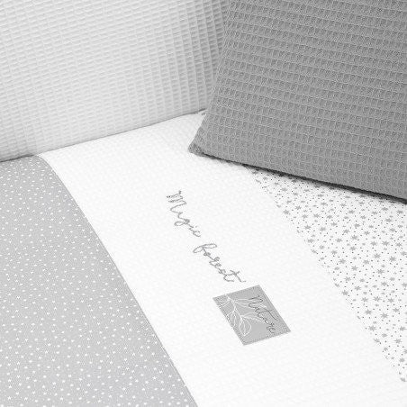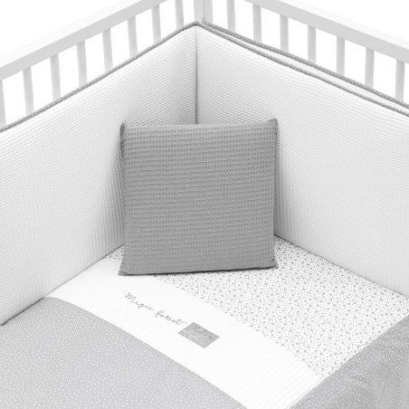 Juego de 2 piezas para vestir la cuna, compuesto por colcha invierno/verano más protector incluye un bonito cojín bordado. La colcha, es la prenda que viste la cuna y cumple el cometido de protección contra el frío como si de una manta o una funda nórdica se tratara. Su cualidad de tener un relleno desenfundable la convierte en una prenda versátil para ser utilizada en invierno y en verano y también ofrece la ventaja de ser lavada con facilidad. Dispone de 3 volantes que cumplen la función de vestir la cuna. El protector fabricado con tejido cuyo interior va acolchado con fibra hueca, amortigua los posibles golpes del bebe contra la cuna.