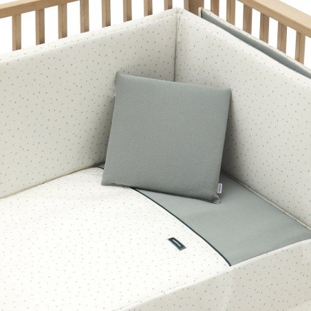 Juego de 2 piezas para vestir la cuna, compuesto por colcha invierno/verano más protector incluye un bonito cojín bordado. La colcha, es la prenda que viste la cuna y cumple el cometido de protección contra el frío como si de una manta o una funda nórdica se tratara. Su cualidad de tener un relleno desenfundable la convierte en una prenda versátil para ser utilizada en invierno y en verano y también ofrece la ventaja de ser lavada con facilidad. Dispone de 3 volantes que cumplen la función de vestir la cuna. El protector fabricado con tejido cuyo interior va acolchado con fibra hueca, amortigua los posibles golpes del bebe contra la cuna.