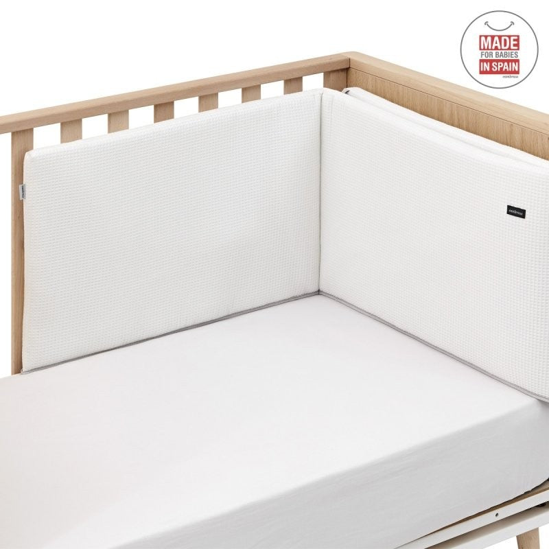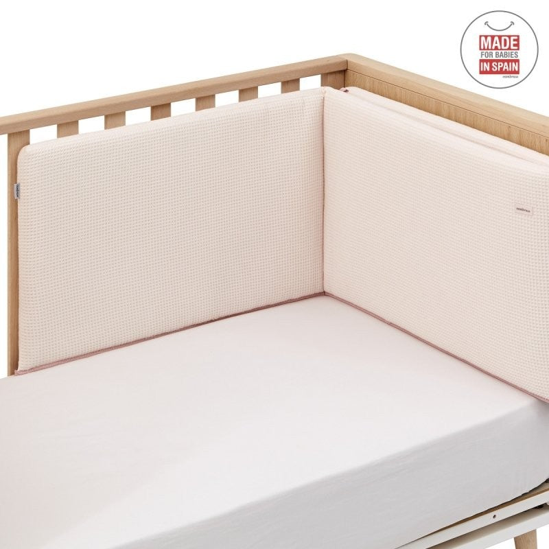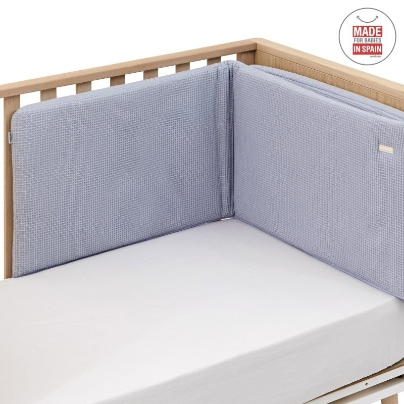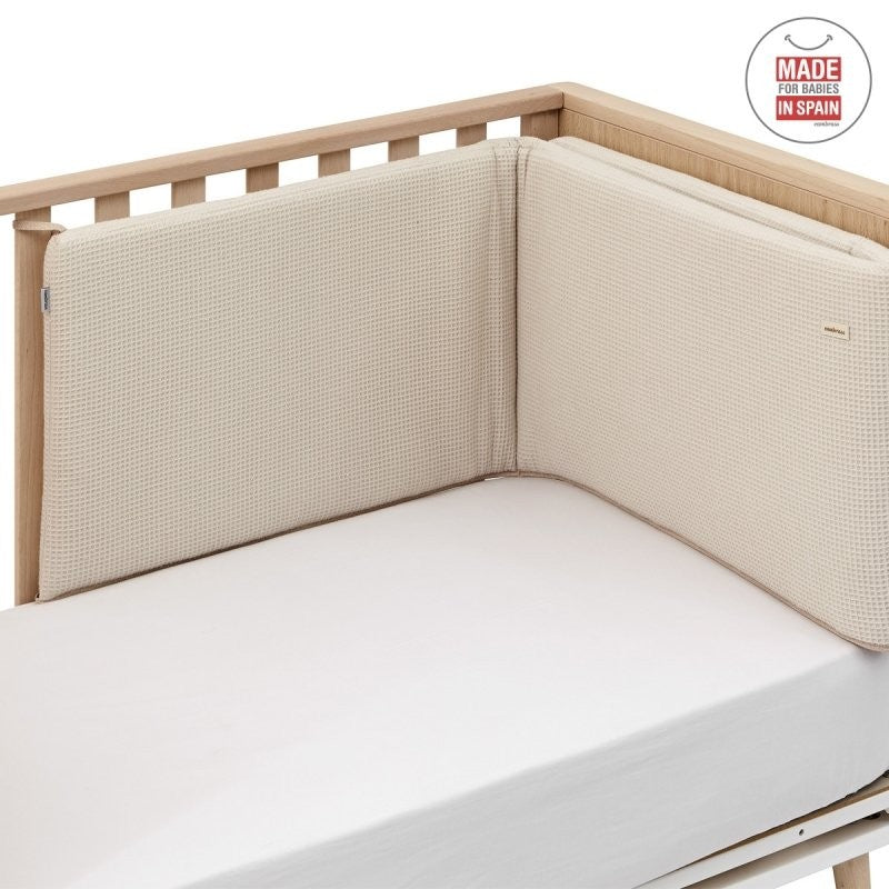 - El protector, fabricado con tejido cuyo interior está acolchado con fibra hueca para amortiguar los posibles golpes del bebé contra la cuna, los cuales se producen por los simples movimientos del bebé cuando está dentro de la cuna.