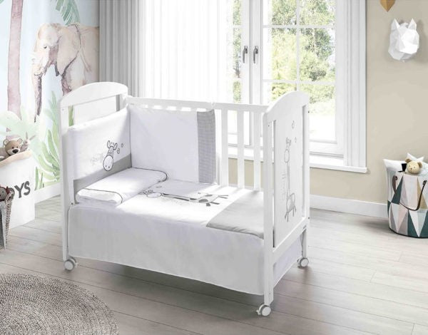 Kit de edredón y protector de una sola pieza dividida en tres partes por dos costuras, lo que facilita la colocación en la cuna. Ambas prendas son desenfundables.