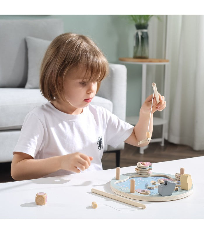 - El juego de pesca magnético incluye 2 cañas de pescar y 12 peces, un dado y un lago de madera.