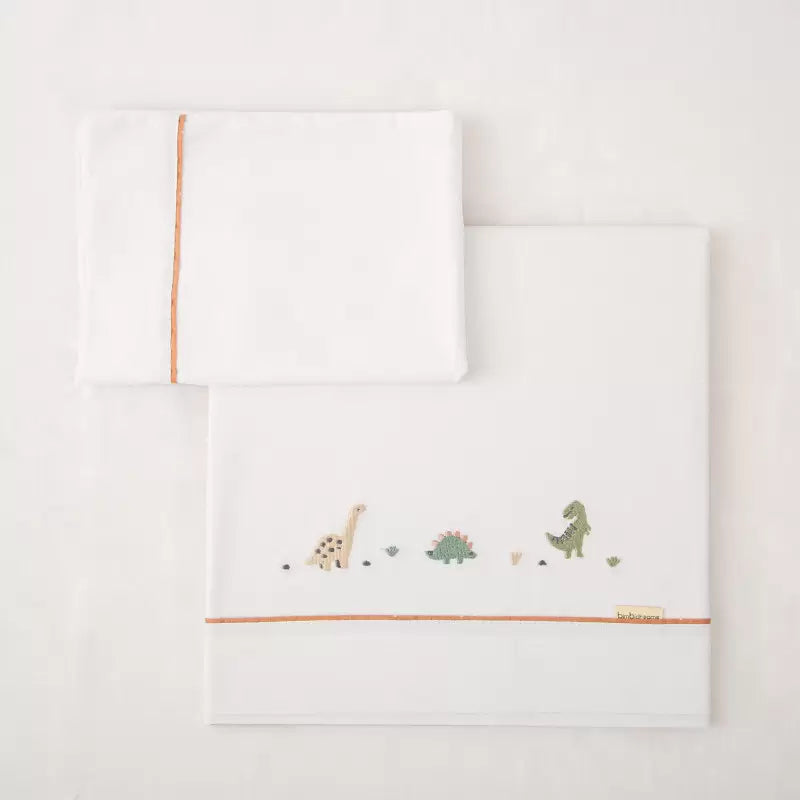 Juego de sábanas de algodón 100% para cuna (60x120), en elegante combinación blanco y naranja, perteneciente a la colección Bronto Chic de Bimbidreams. Este set de 3 piezas ofrece suavidad, transpirabilidad y confort, ideal para proporcionar un descanso cómodo y seguro al bebé con un diseño vibrante y moderno.