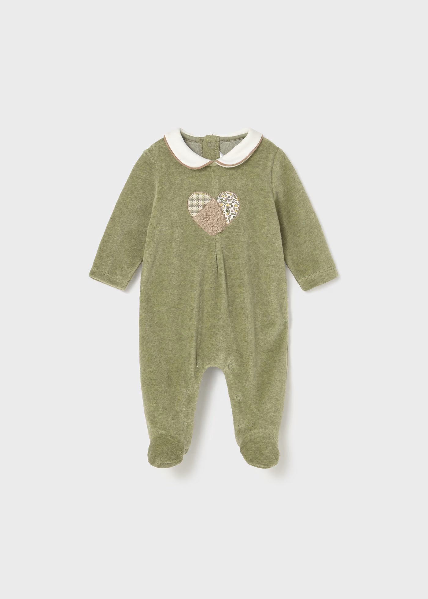 Pelele de manga larga para recién nacida. Cuello bebé. Cierre con botones a presión en la parte posterior. Botones a presión en la entrepierna para facilitar la puesta de la prenda. Elementos de adorno: aplique decorativo, bordado.