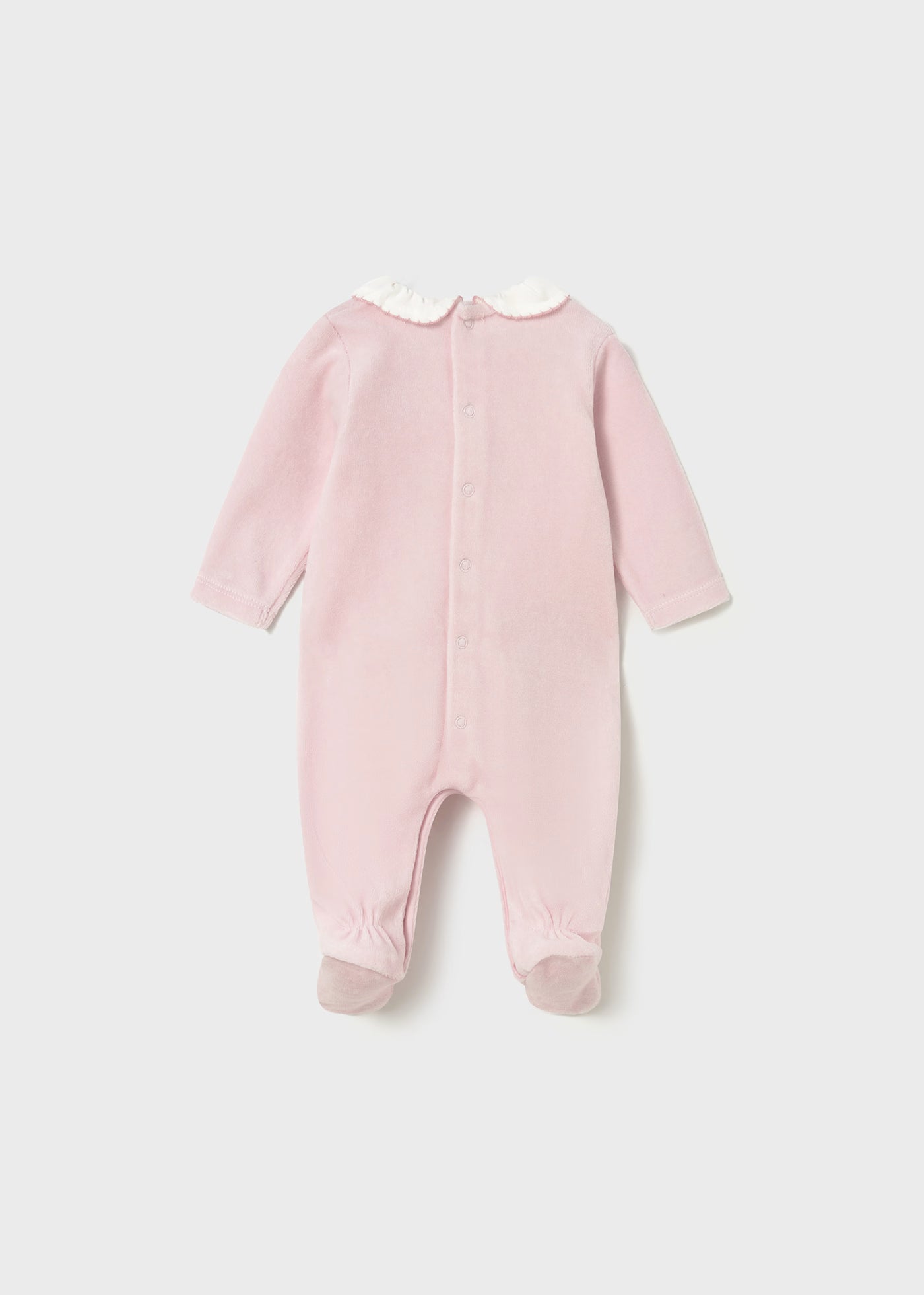 Pelele de manga larga para recién nacida. Cuello redondo con volante. Cierre con botones a presión en la parte posterior. Botones a presión en la entrepierna para facilitar la puesta de la prenda. Elementos de adorno: apliques decorativos, bordados.