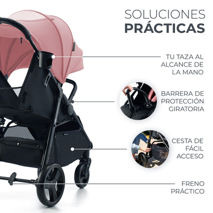Tiene una capota impermeable con filtro UPF50+, así como un protector solar adicional. Las 4 ruedas están totalmente amortiguadas, por lo que podrás pasear por la ciudad e irte de excursión por parques sin problemas.