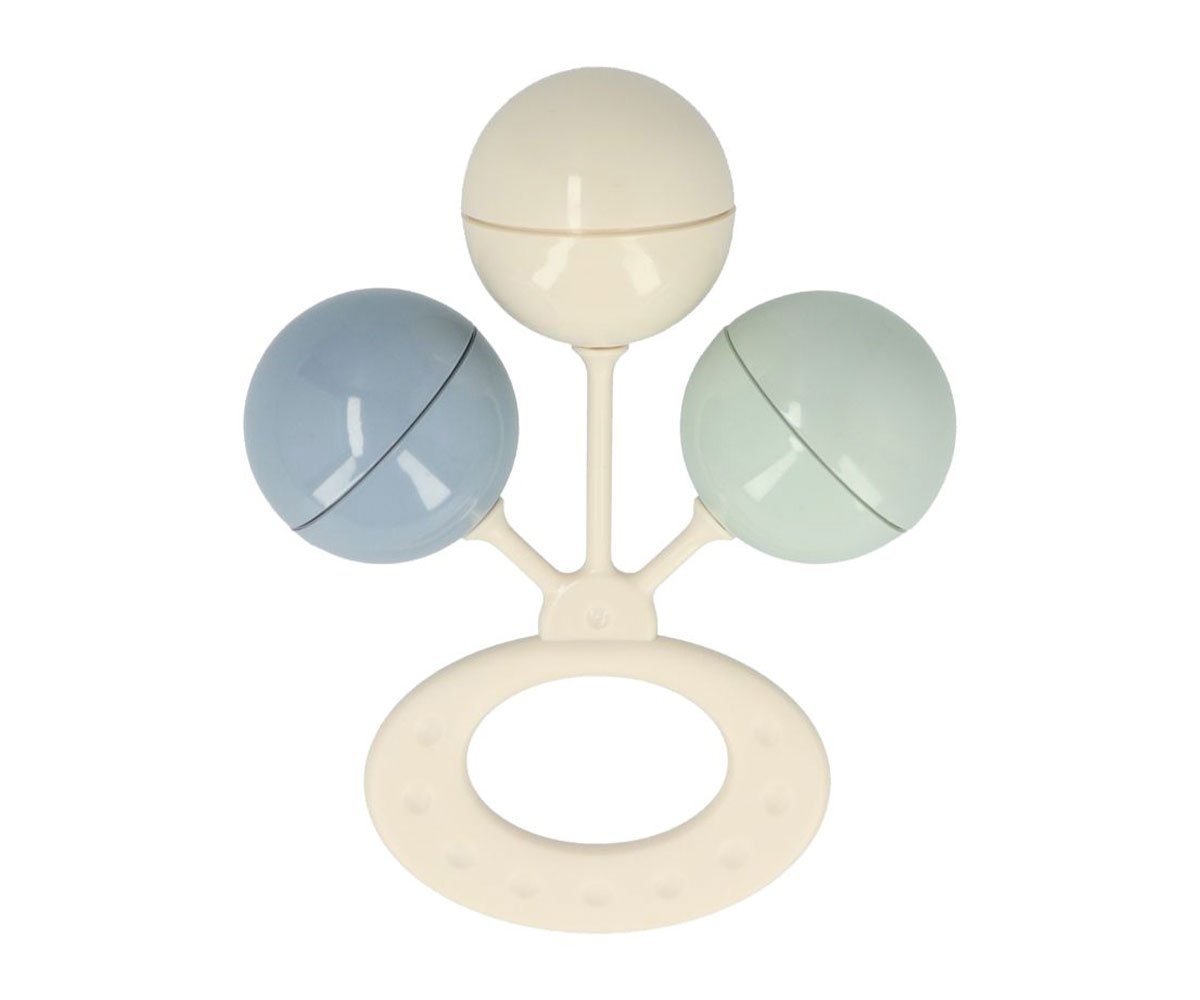Sonajero compuesto por 3 bolitas de distintos colores y con un mordedor en el asa.
