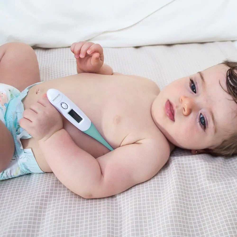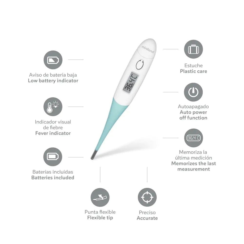 Termómetro corporal, flexible y resistente. thermoflexi mide de forma sencilla la temperatura corporal de tu bebé mediante medición oral, axilar o rectal. Cuenta con un cuello de goma, que dota a la punta de una alta flexibilidad y resistencia frente a golpes. Registra también los datos de la última medición.