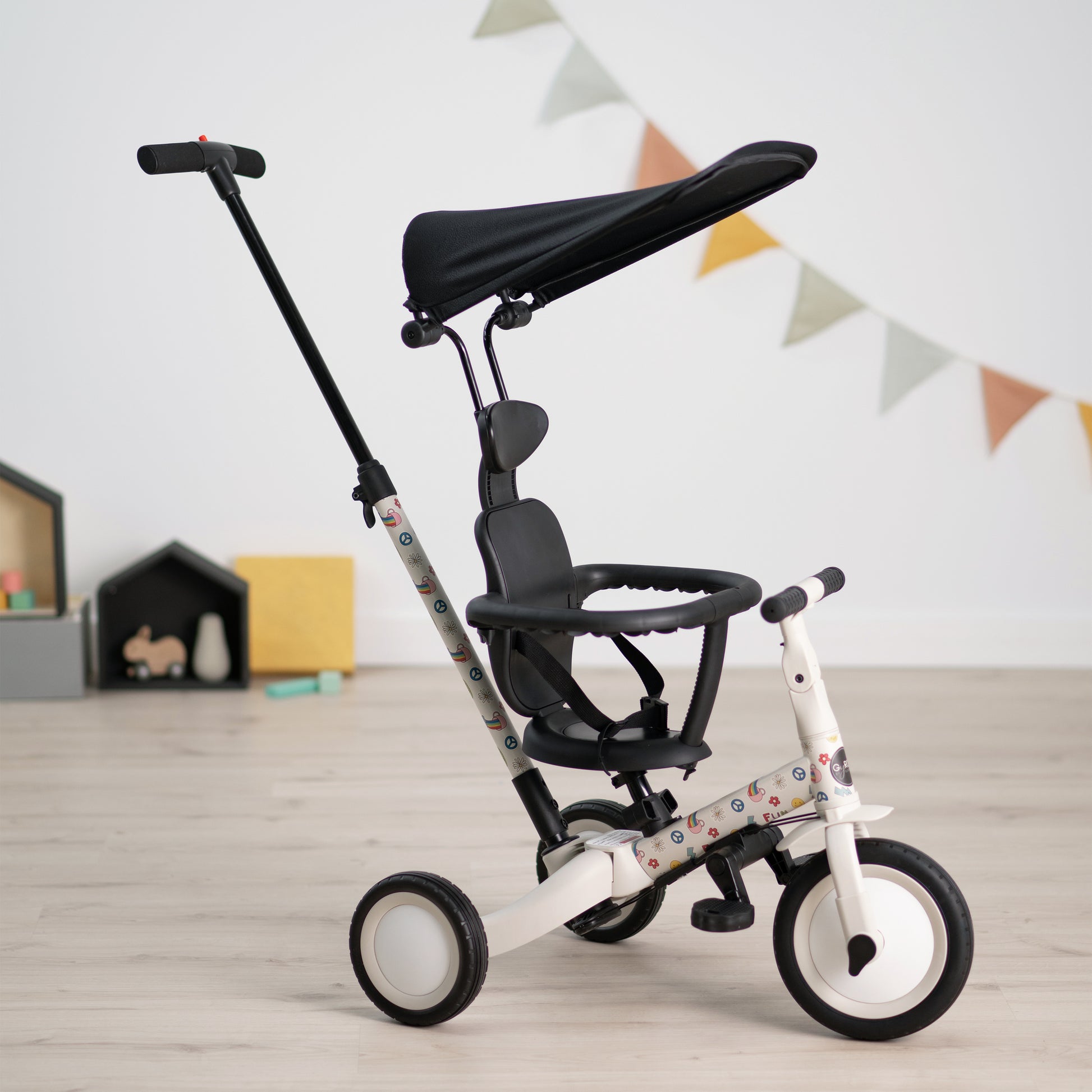 - Provisto de un sencillo sistema que permite transformar la bicicleta sin herramientas y ajustarla a la edad del niño.
