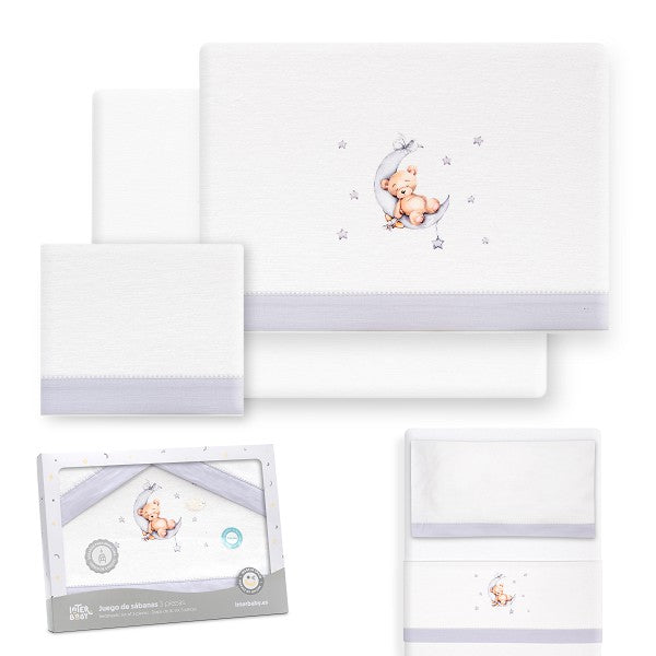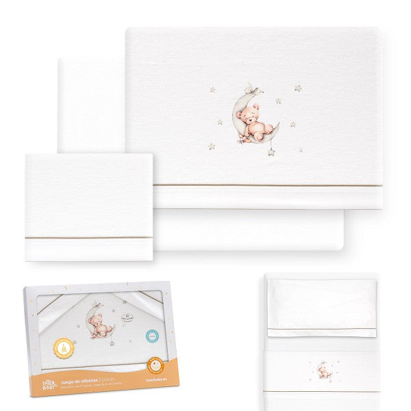Juego de Minicuna con tejido de franela de la firma Interbaby. El juego está compuesto de 3 piezas . Tiene un tacto extra suave y gracias a su calidad una gran durabilidad.