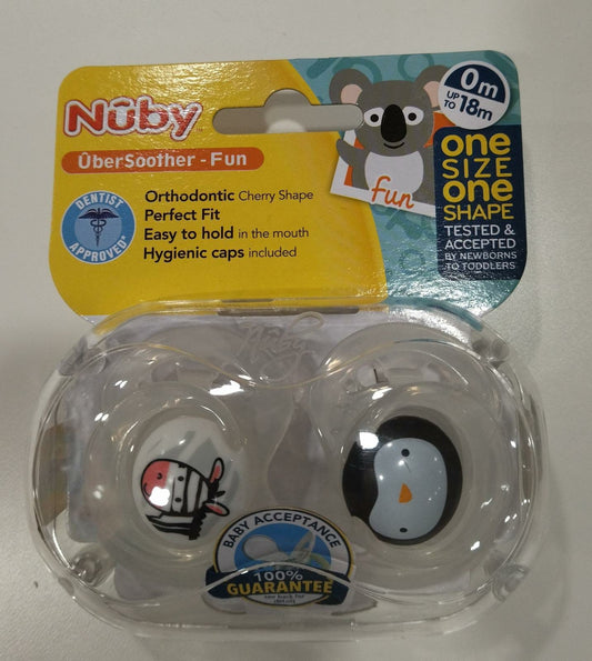 Pacote de duas chupetas de animais zebra e pinguim 0/18M da Nuby