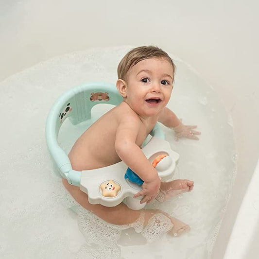 - Um assento de esponja O assento macio tornará o seu bebê muito confortável para se curvar durante o banho. O assento apoia e protege a cabecinha delicada do bebê, evitando que ela bata nas bordas da banheira, enquanto libera suas mãos para que você possa dar banho no seu bebê com o máximo conforto.