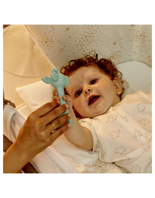 Desarrollo de la motricidad fina: Sujetar y manipular el mordedor ayuda a fortalecer las manos y dedos del bebé.