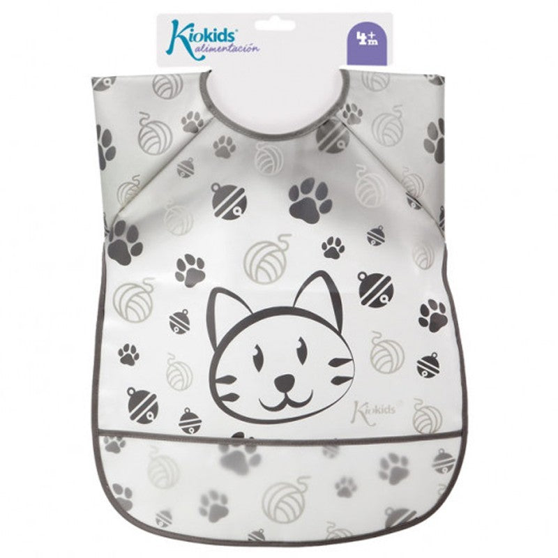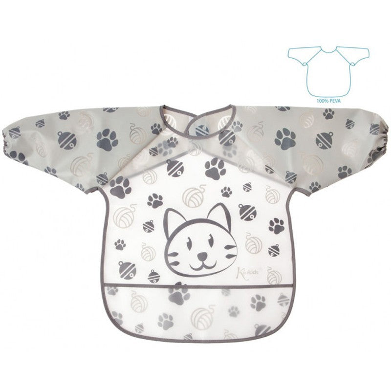 Nosso babador com mangas é feito 100% PEVA, muito macio, confortável e impermeável.