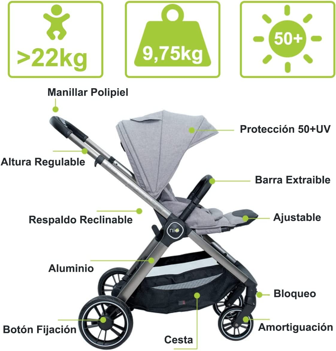 - O carrinho pesa 9,75kg e está preparado para uso desde o nascimento até os 22kg. Ele também oferece proteção solar anti-UV 50+.