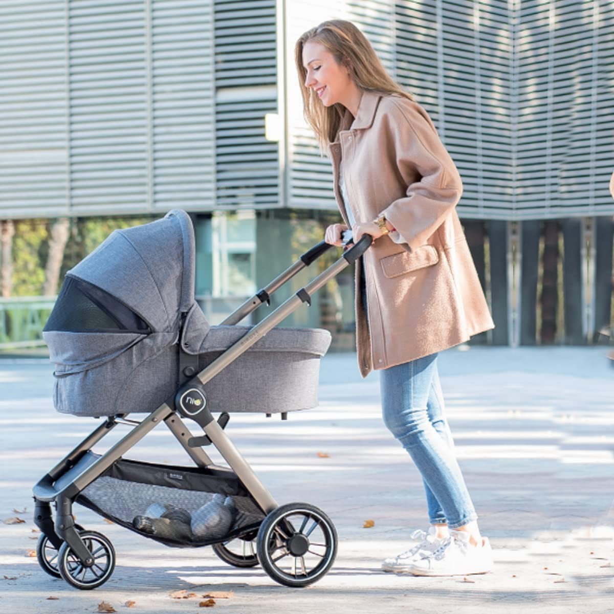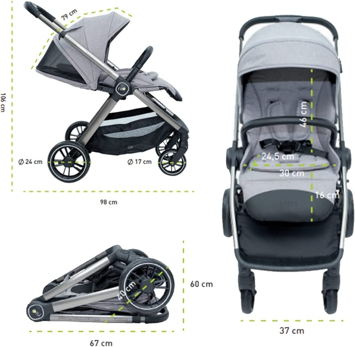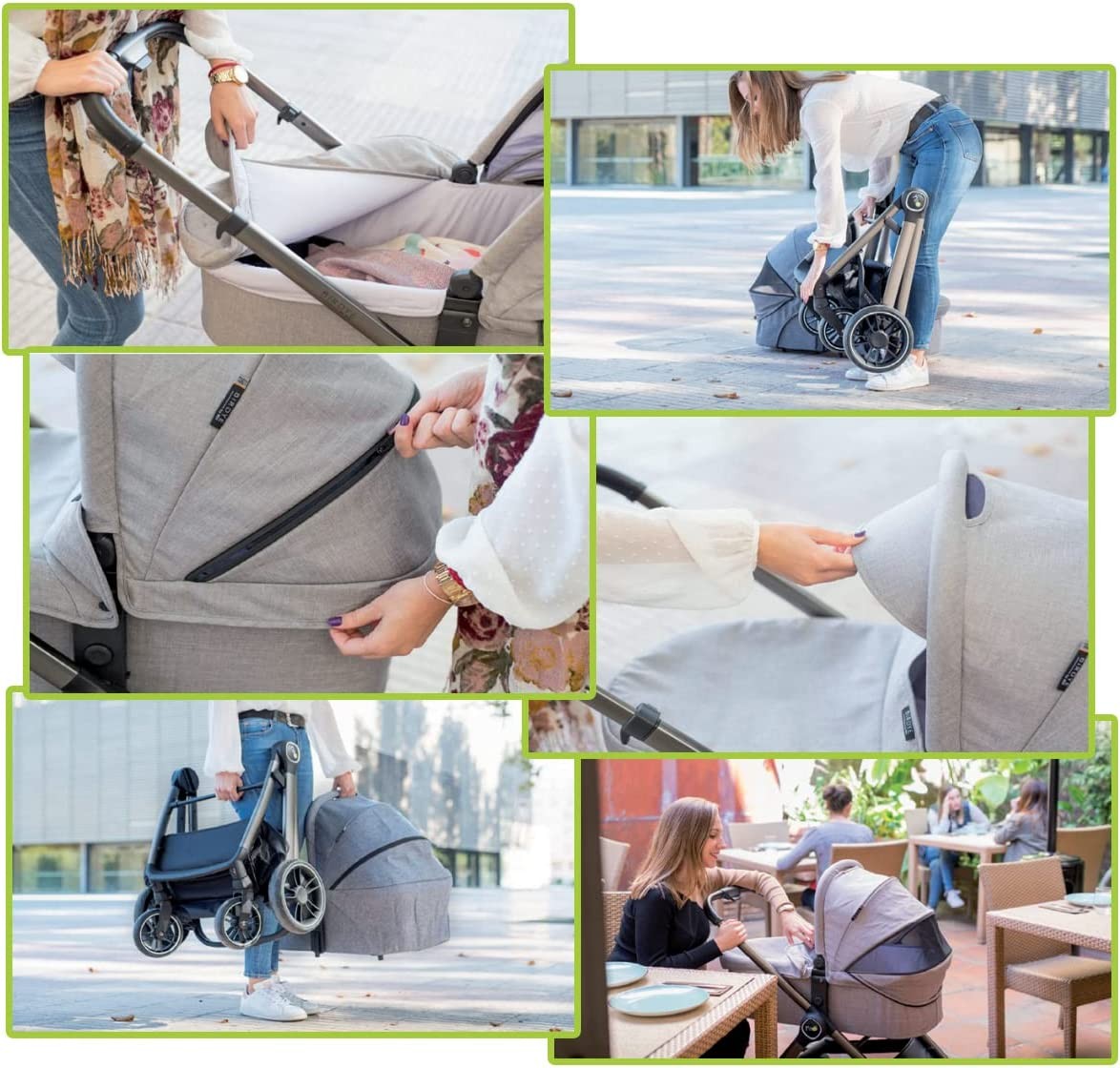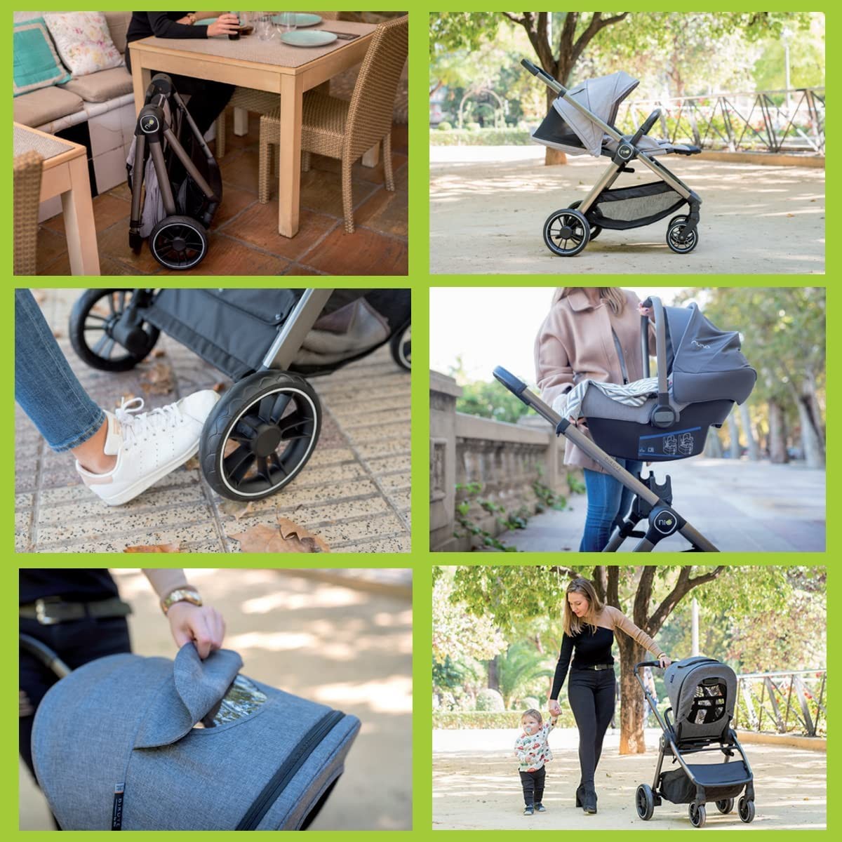 - Freio de segurança com um toque Reclinação total até a posição deitada Compacto, dobrável em duas direções com uma mão Cobertura removível para os pés Grande e espaçoso Transporte fácil Capuz extensível Capuz com sistema de ventilação Dobramento fácil