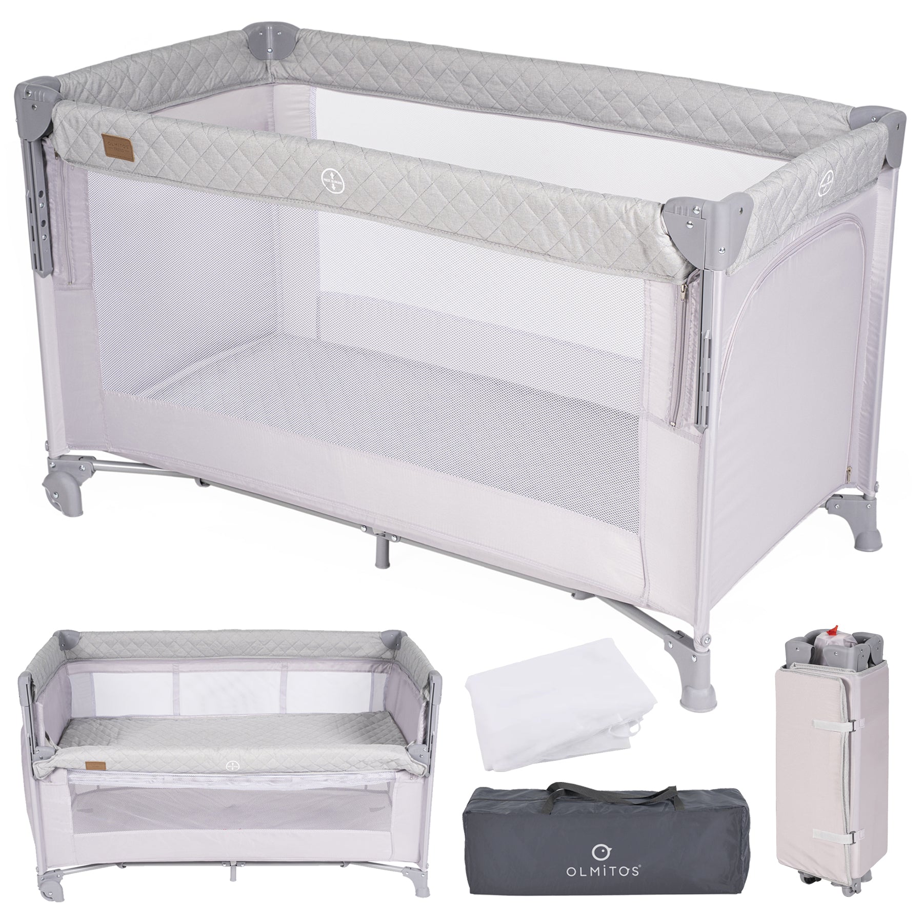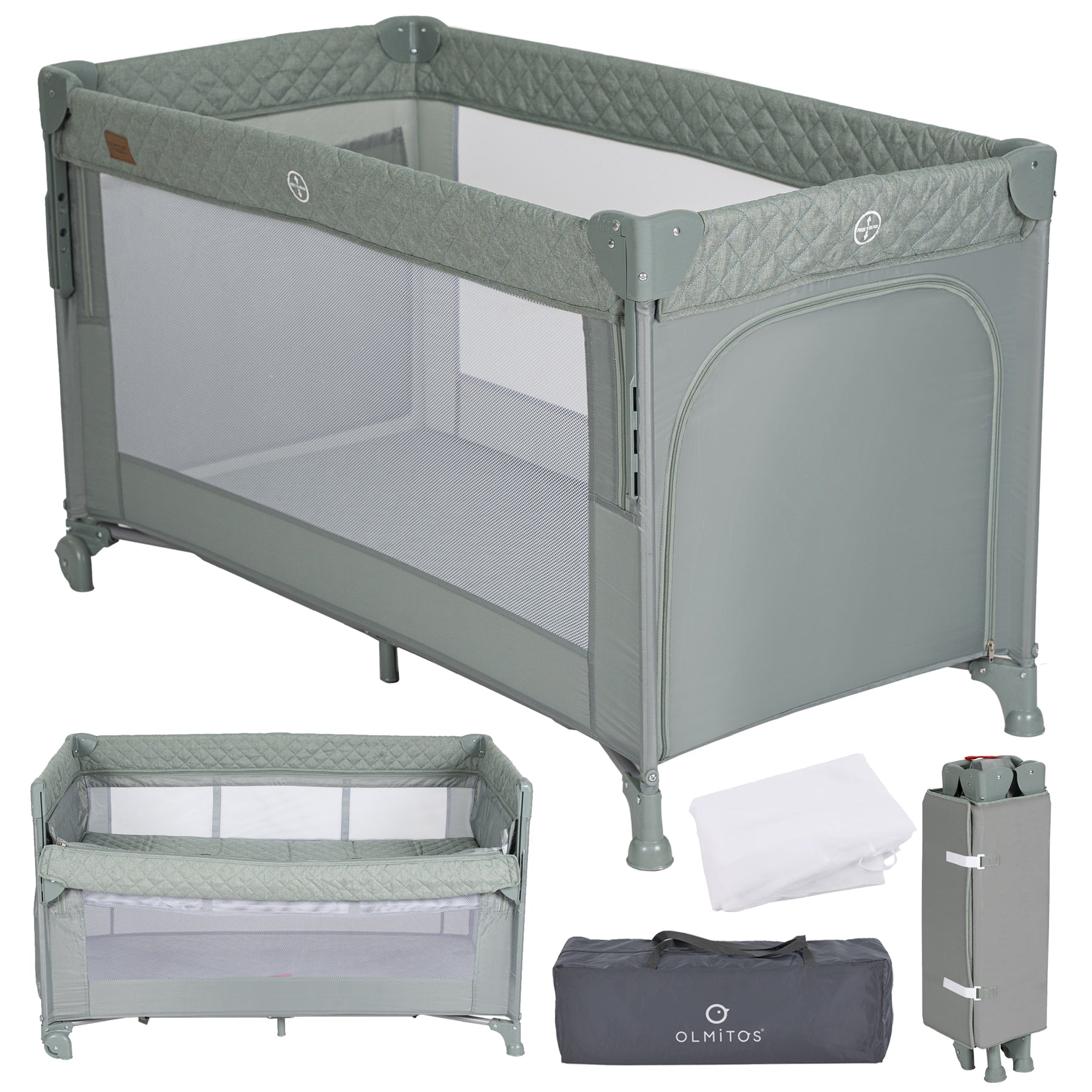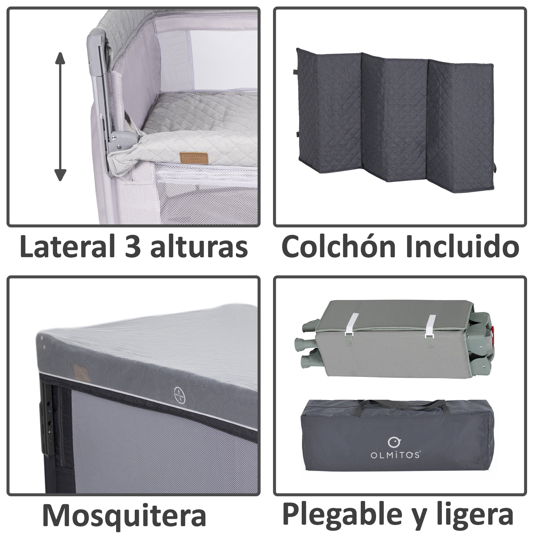 O berço de viagem co-sleeping Olmitos TREND foi projetado pensando no conforto, na segurança e na praticidade que pais e bebês precisam. Perfeito para dormir ao lado do seu filho sem compartilhar a mesma superfície, este berço possui uma lateral dobrável com 3 alturas ajustáveis, facilitando a amamentação e os cuidados noturnos sem perturbar o sono de nenhuma das crianças. Graças à sua estrutura dobrável e leve, você pode levá-lo facilmente em suas viagens. Inclui uma bolsa de transporte compacta e prática.