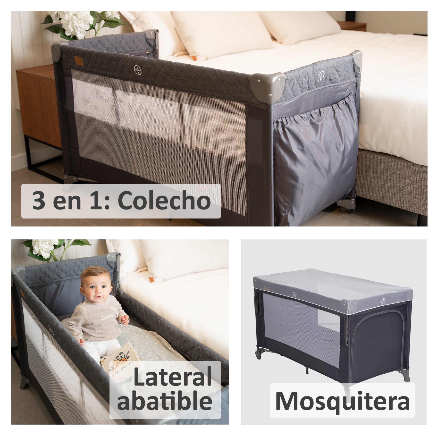 ⭐ Berço de viagem co-sleeping 3 em 1: use-o como berço independente, cercadinho ou co-sleeping graças à sua lateral dobrável, ajustável em 3 alturas, para caber em qualquer cama.