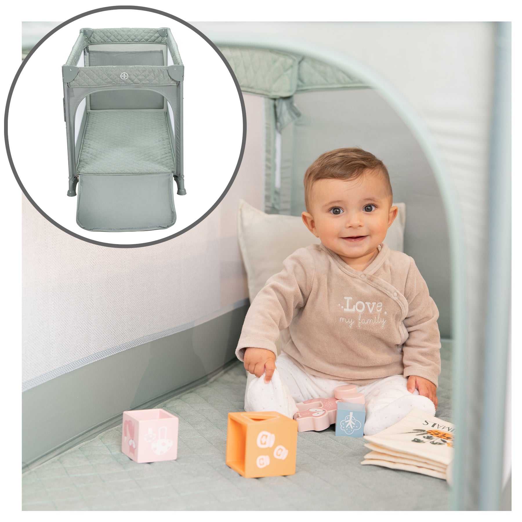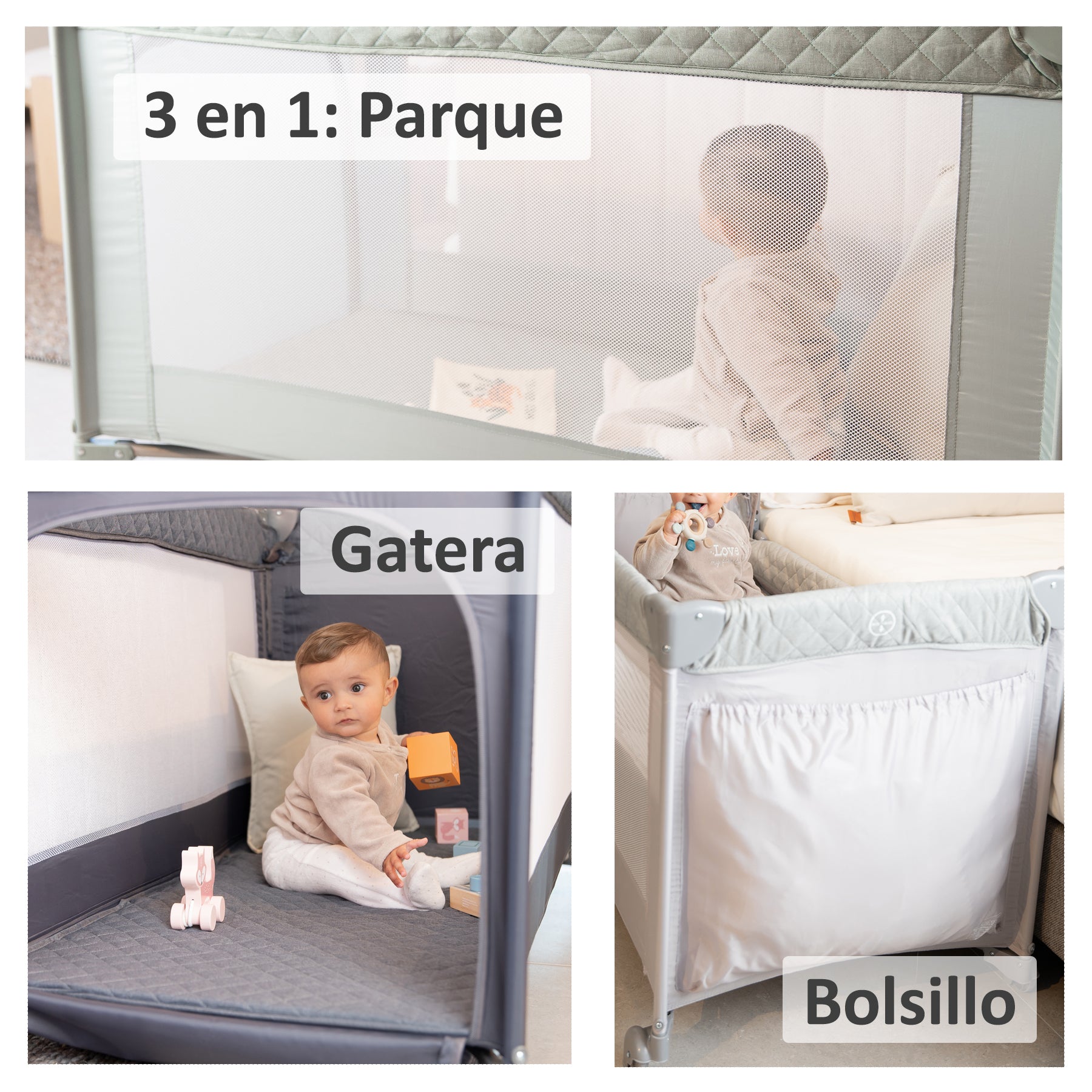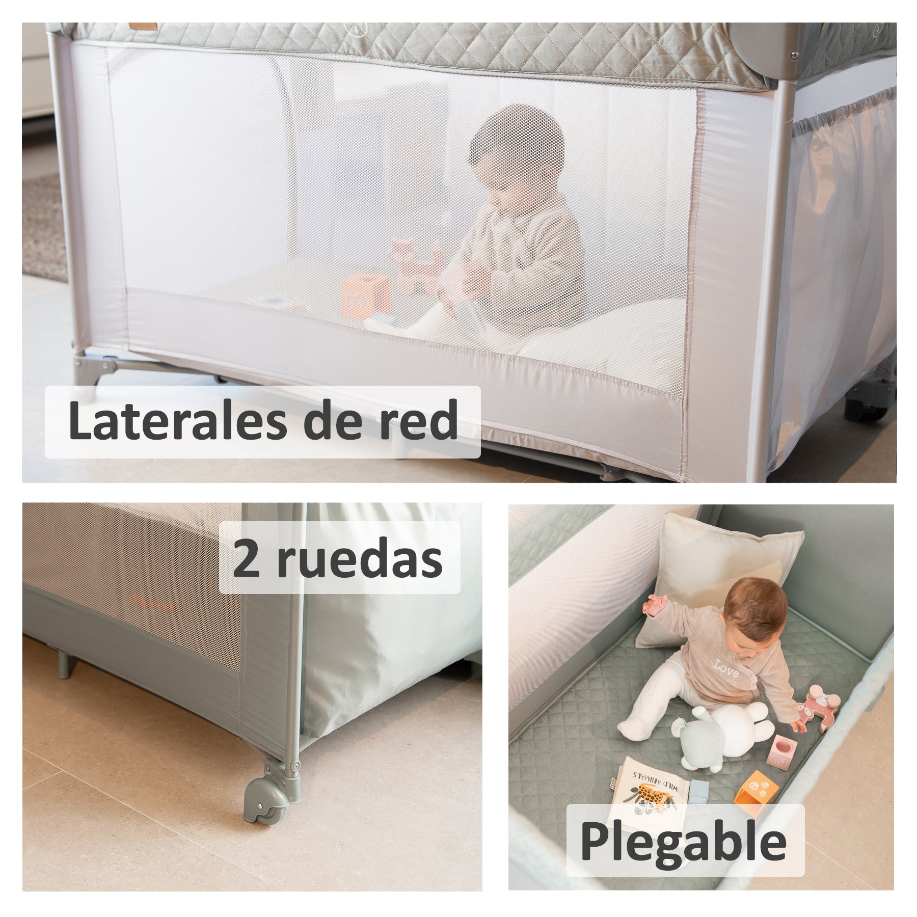 Com seu sistema de altura dupla, é adequado desde o nascimento até os 15 kg e se transforma facilmente em um cercadinho com uma divertida portinhola para gatos, para que seu filho possa entrar e sair sozinho enquanto brinca. As laterais de tela garantem ventilação ideal e visibilidade perfeita para o seu bebê, enquanto a rede mosquiteira incluída oferece uma barreira eficaz contra insetos, especialmente útil no verão ou em climas mais quentes. O amplo bolso lateral também mantém brinquedos ou produtos de higiene essenciais sempre à mão.