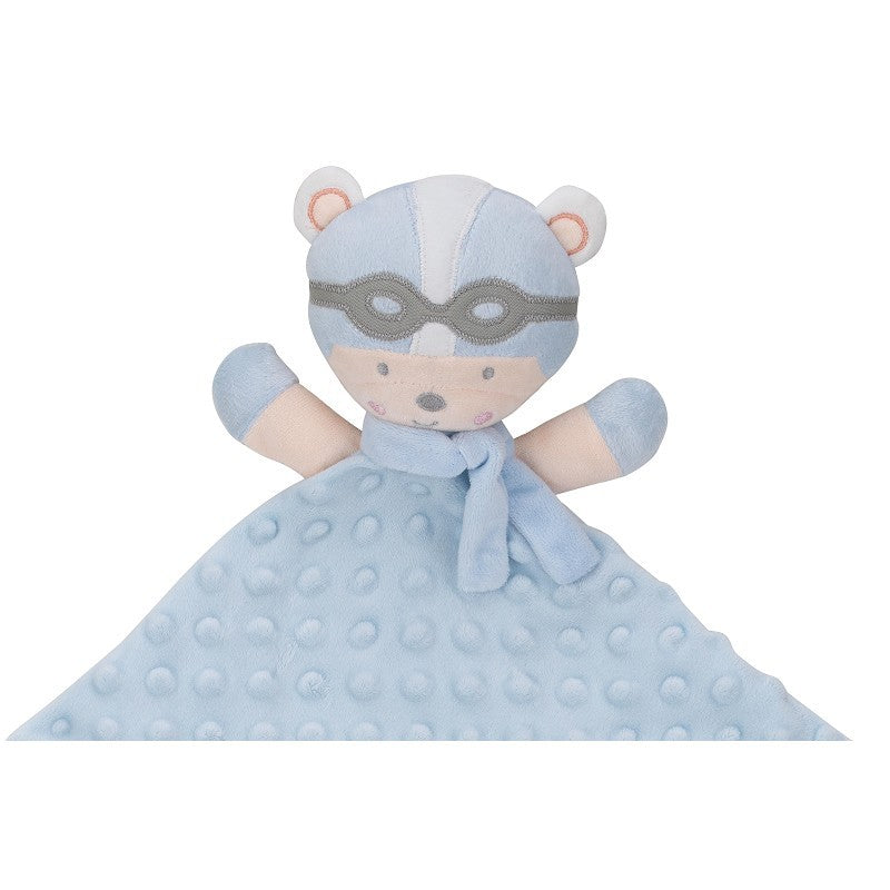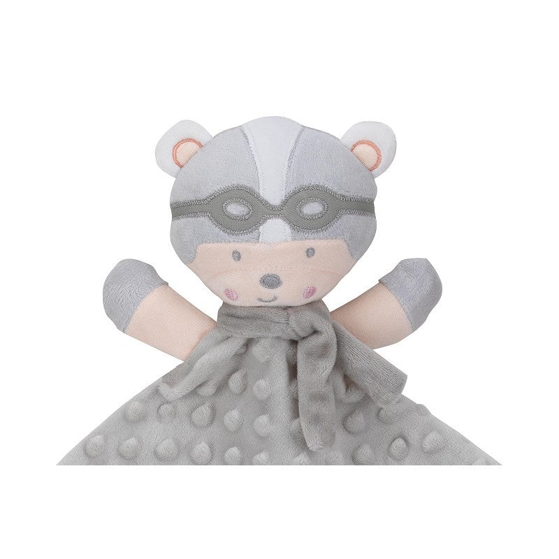 O Paraquedista dou é de cor cinza e tem a cabeça macia e o corpo, a manta, tem um toque aveludado muito agradável para que seu bebê durma abraçado.