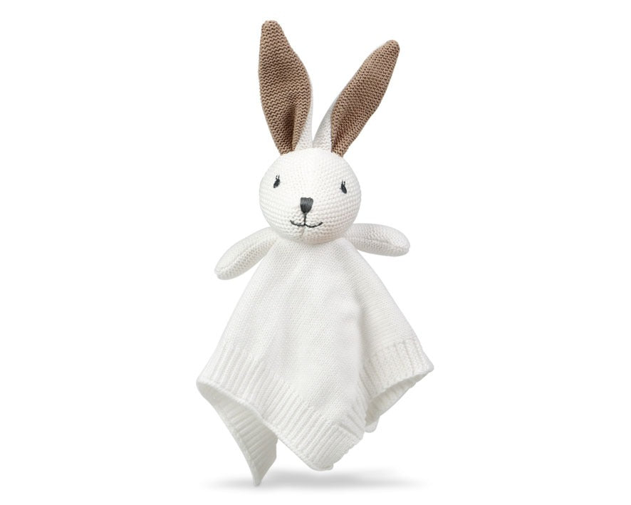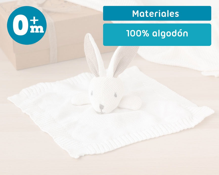 Neste caso, é um doudou super fofo e agradável no formato de um coelho bege com orelhas grandes.