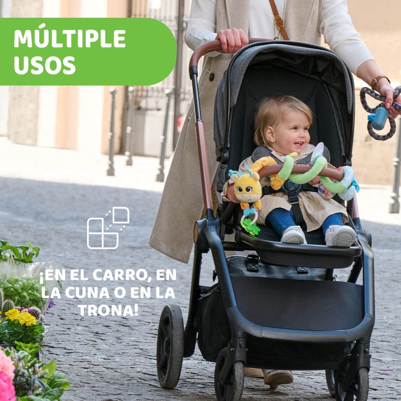 FIXAÇÃO UNIVERSAL: Você pode fixar este divertido brinquedo no carrinho do seu filho, parafusando-o na barra frontal do carrinho, ou até mesmo no berço ou cercadinho, graças aos seus práticos cordões de tecido para evitar que ele caia no chão.