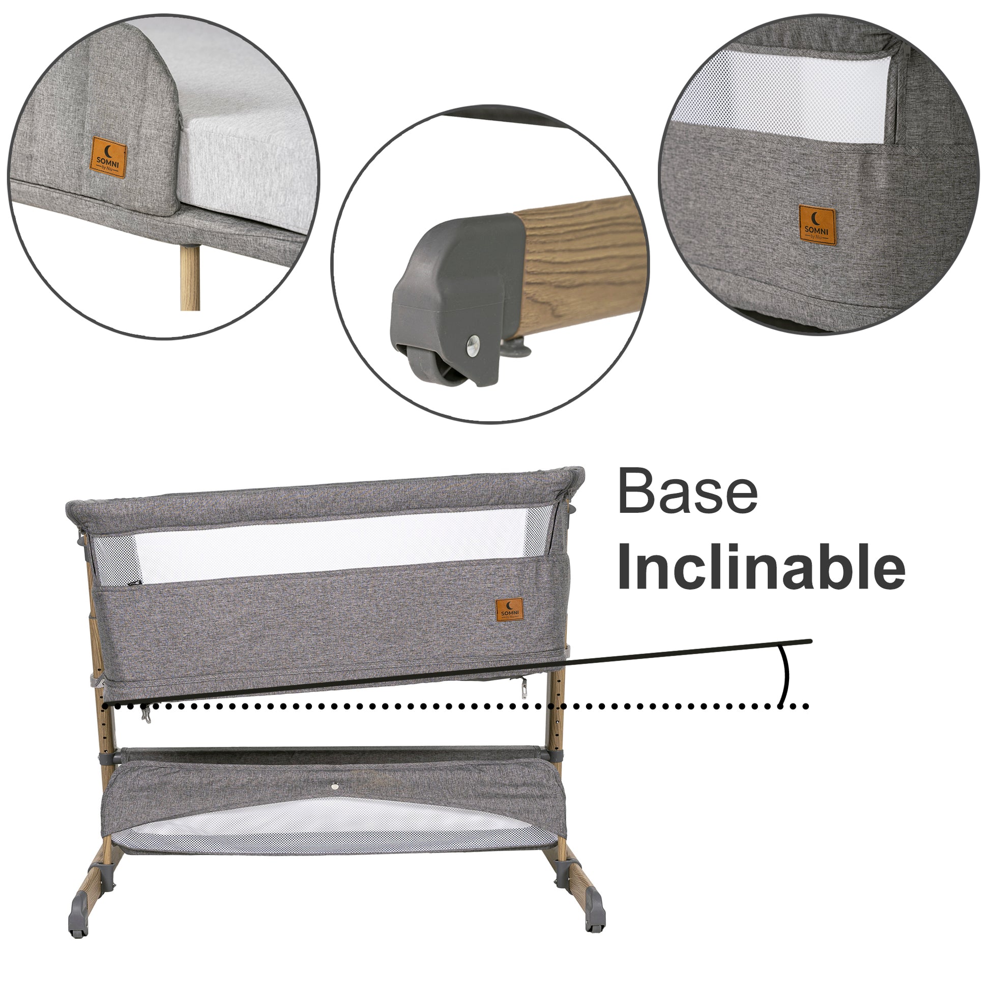 A base do mini berço pode ser inclinada levemente ajustando os dois pés em alturas diferentes para facilitar a digestão do bebê ou ajudá-lo a respirar melhor em caso de congestão nasal.