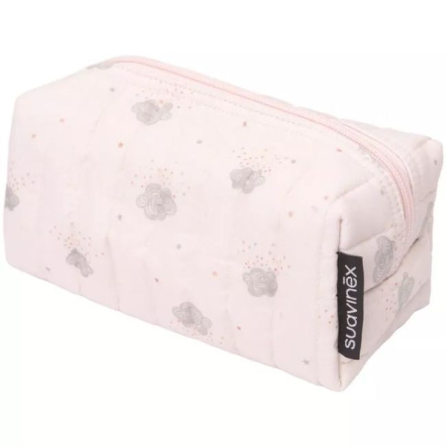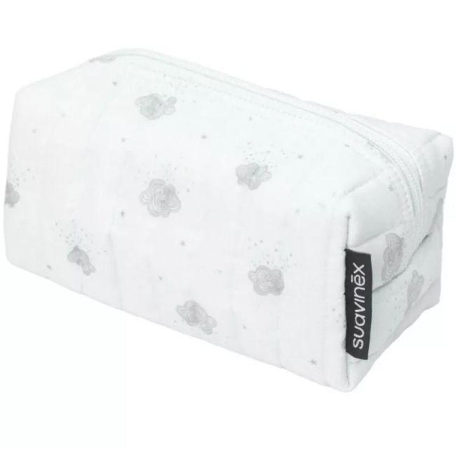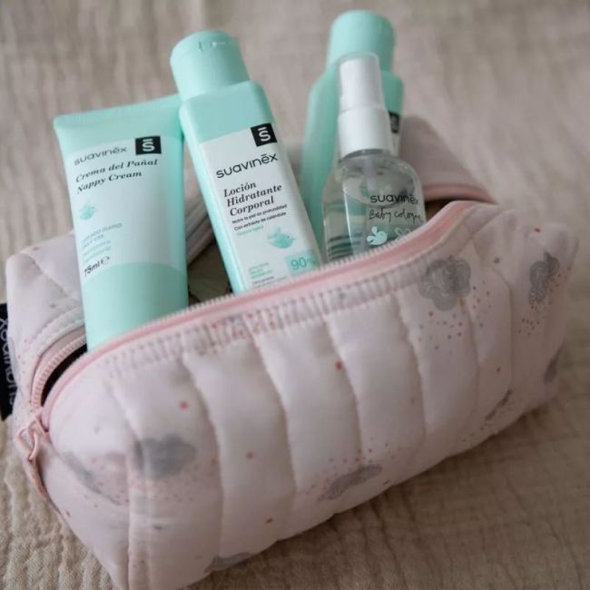 Linda nécessaire de tecido, tamanho viagem, para recém-nascidos, da Suavinex. Ela contém todos os produtos essenciais para os cuidados do seu bebê. Uma nécessaire para manter seu bebê sempre limpo e fresco com nossos produtos cosméticos pediátricos.