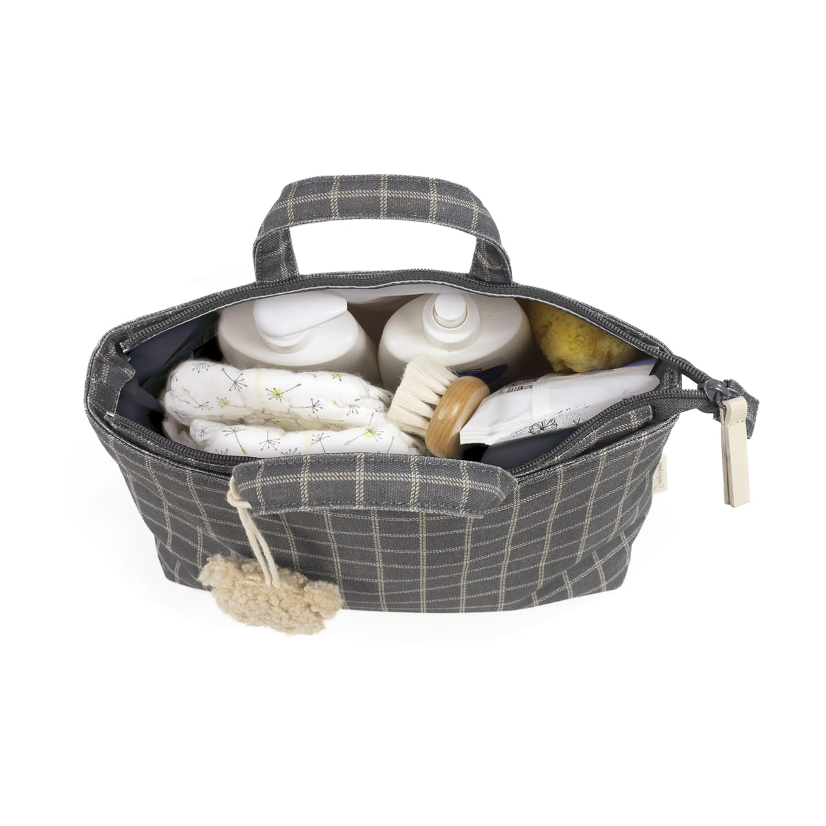El neceser de bebé Tartan en cuadro gris de Pasito a pasito elaborado en resistente algodón con un tratamiento waterproof es un bolso pequeño especialmente pensado para llevar todos los productos de aseo de nuestro bebé al salir de casa. Es un modelo único con mucho estilo para adecuarse a lo que necesitas. Es un diseño bonito, simple y cómodo que ofrece un espacio pequeño pero preciso para llevar justo lo que necesitas para la higiene de tu bebé, peine, lociones y otros objetos que por ser tan pequeños a veces se pierden dentro del bolso canastilla. Cuenta con un cierre de cremallera de fácil apertura. Acabados de calidad. Está fabricado con materiales de gran calidad, libres de colorantes azoicos, ftalatos y sustancias nocivas para la salud. Además se puede lavar a mano o a máquina a temperaturas de hasta 30º. Los productos para bebé de Pasito a Pasito cuentan con un diseño muy diferente a todas las demás. Sus colecciones se caracterizan por el trabajo al detallada, pensadas siempre desde un punto de vista práctico. Utilizan materiales de primera calidad para remarcar la elegancia y la armonía en cada una de sus piezas. Nuestros modelos son exclusivos y de estilo inconfundible, pensados en madres actuales que gozan de buen gusto y que aprecian los detalles tanto como nosotros. Especificaciones: Materiales: 100% algodón con tratamiento waterproof. Medidas: 30X21X7 cm.