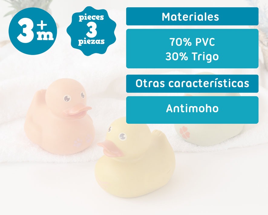 Este conjunto de 3 patinhos resistentes a mofo foi projetado para transformar a hora do banho do seu bebê em uma experiência divertida e segura. Feitos de um material inovador que combina PVC e trigo (30% trigo e 70% PVC), esses patinhos são macios ao toque, fáceis de segurar e totalmente seguros para os pequenos.