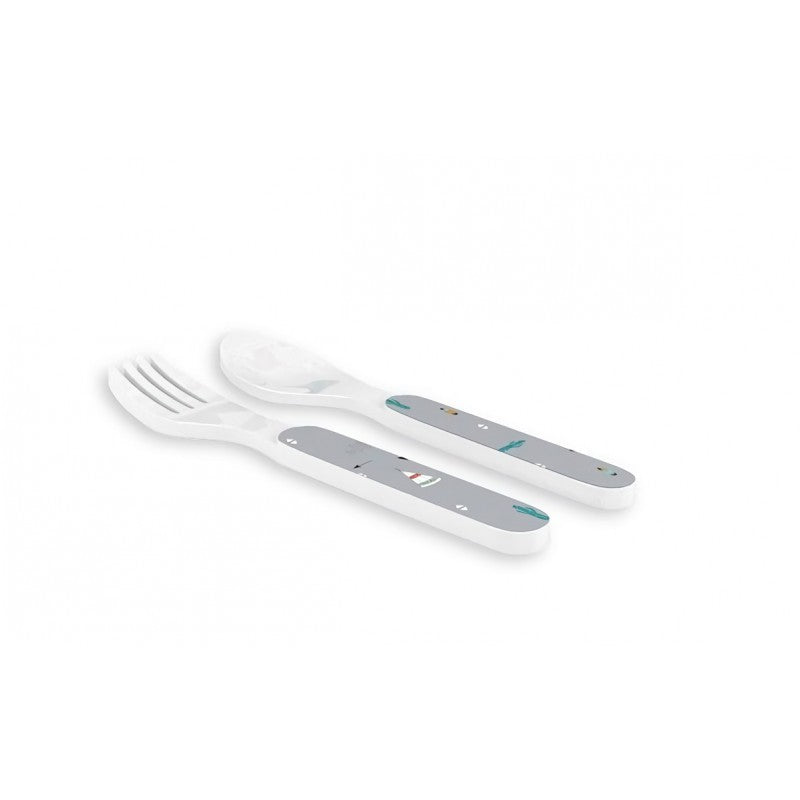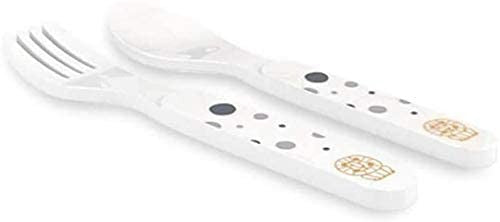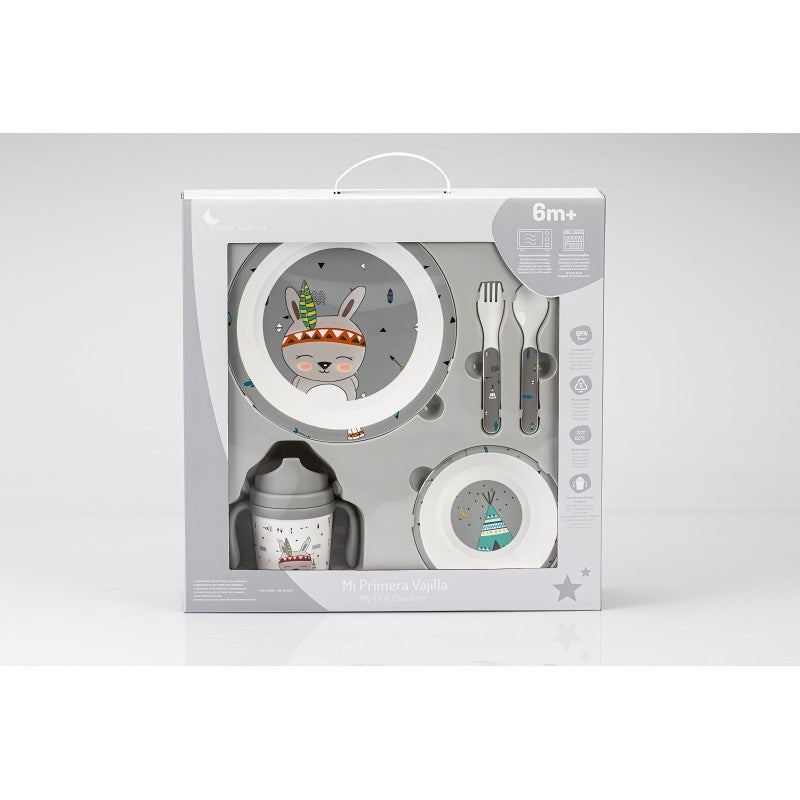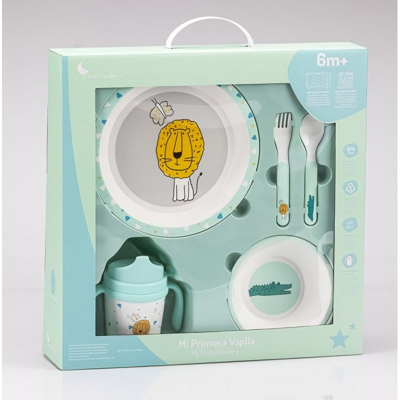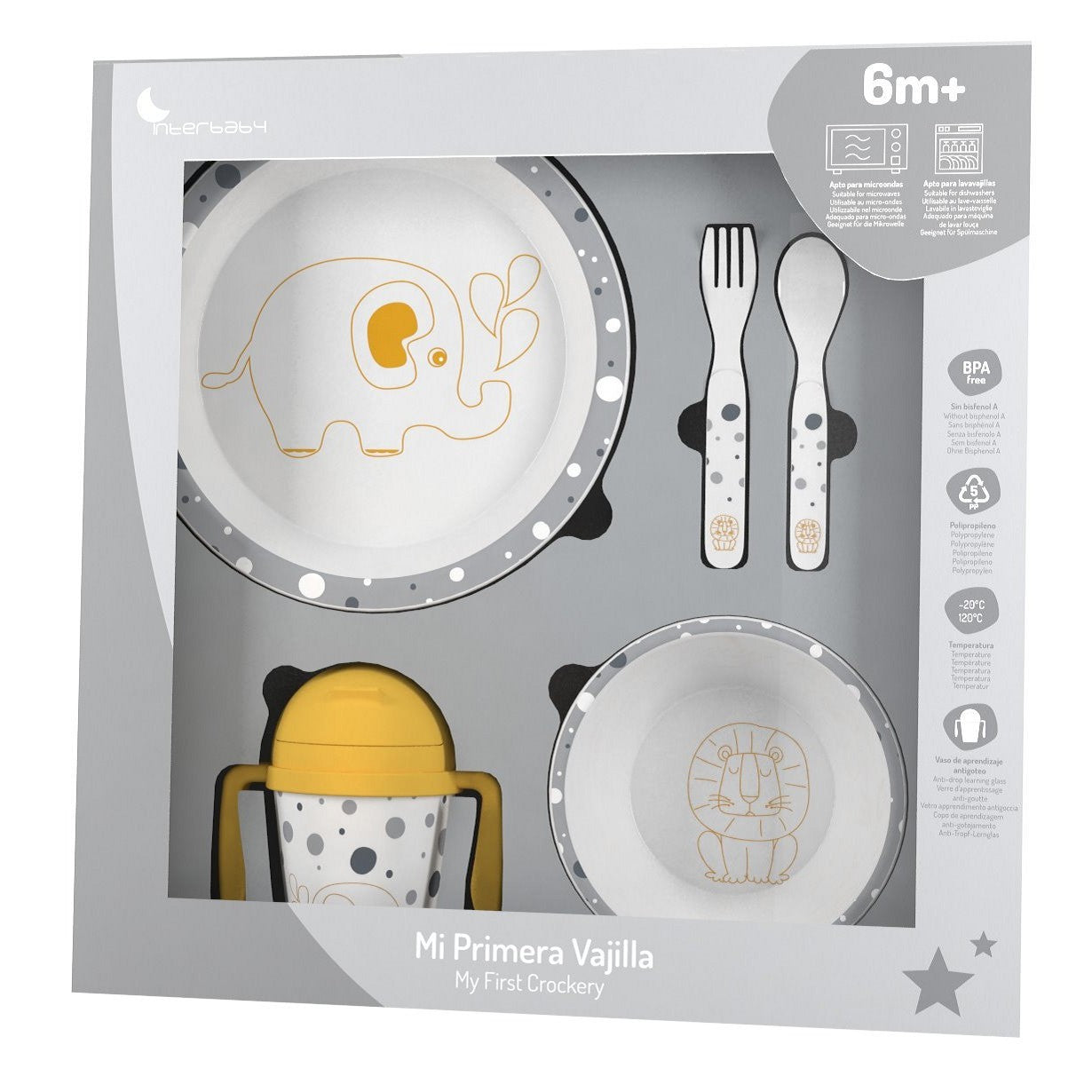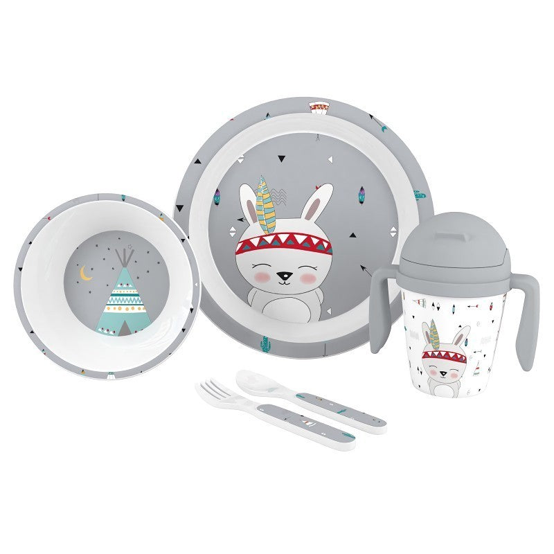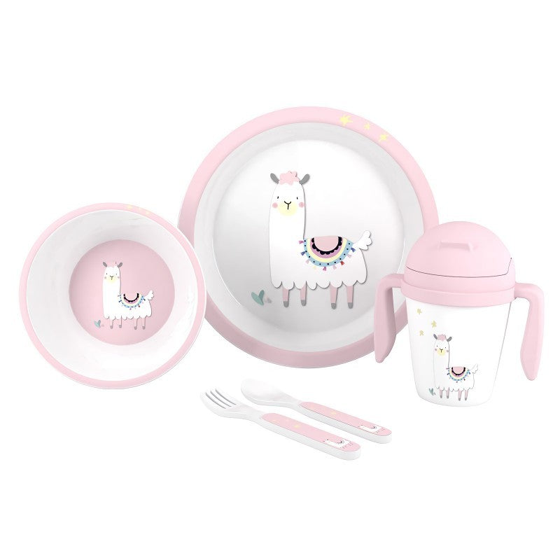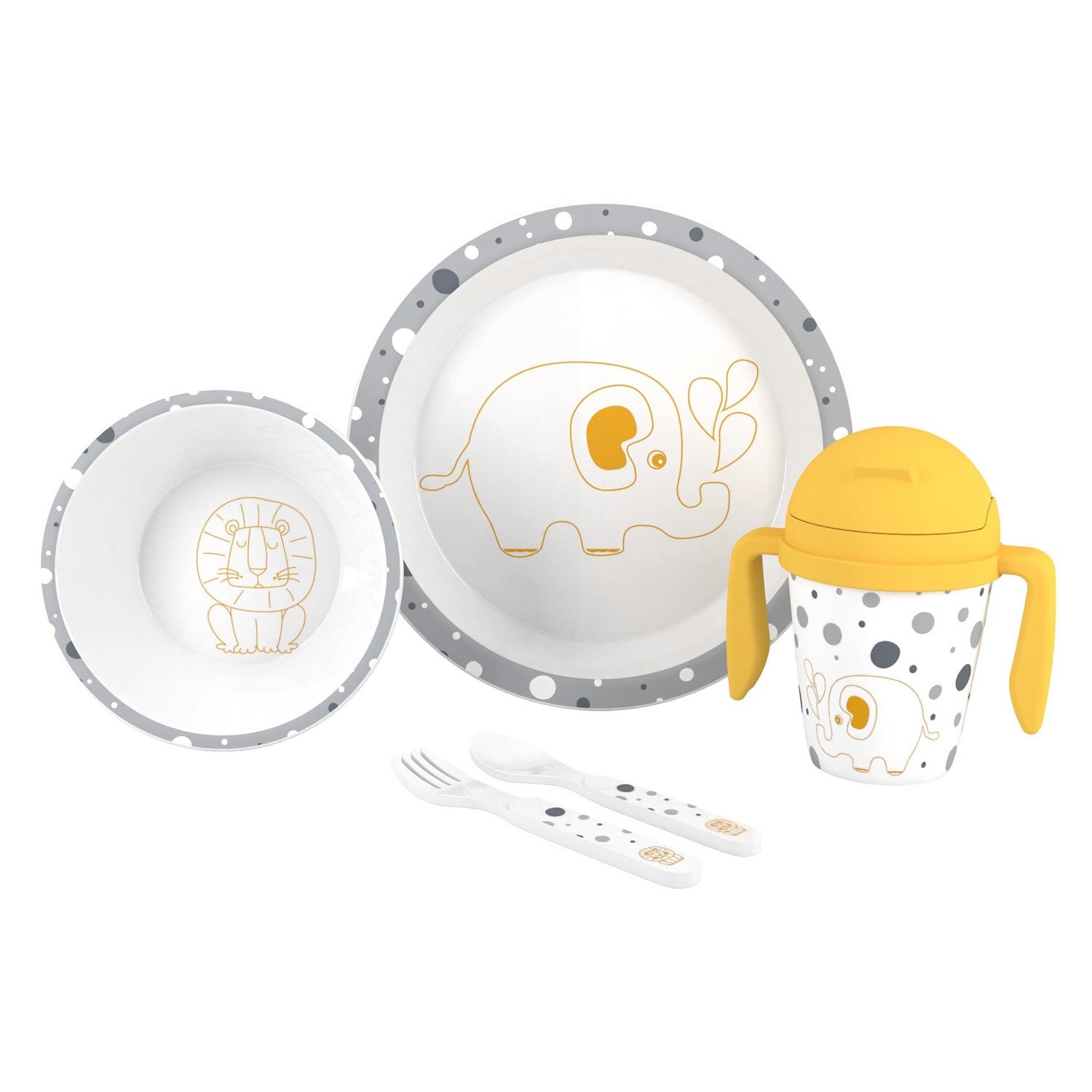 Louça de 5 peças composta por prato raso, tigela, copo de aprendizagem à prova de gotejamento e talheres (garfo e colher)