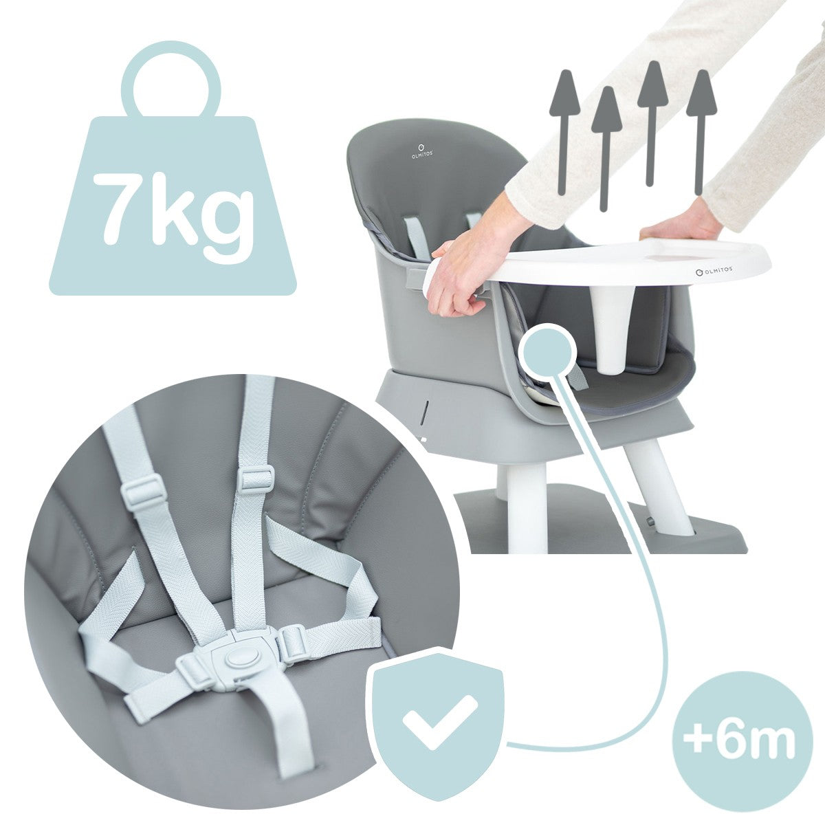 Uma das principais vantagens da cadeira alta multifuncional 5 em 1 Olmitos é a sua segurança. Ela possui um cinto de segurança de 5 pontos e uma área entrepernas para manter o bebê seguro e evitar que ele escorregue durante a alimentação. Sua base estável e construção robusta também evitam que a cadeira alta tombe.